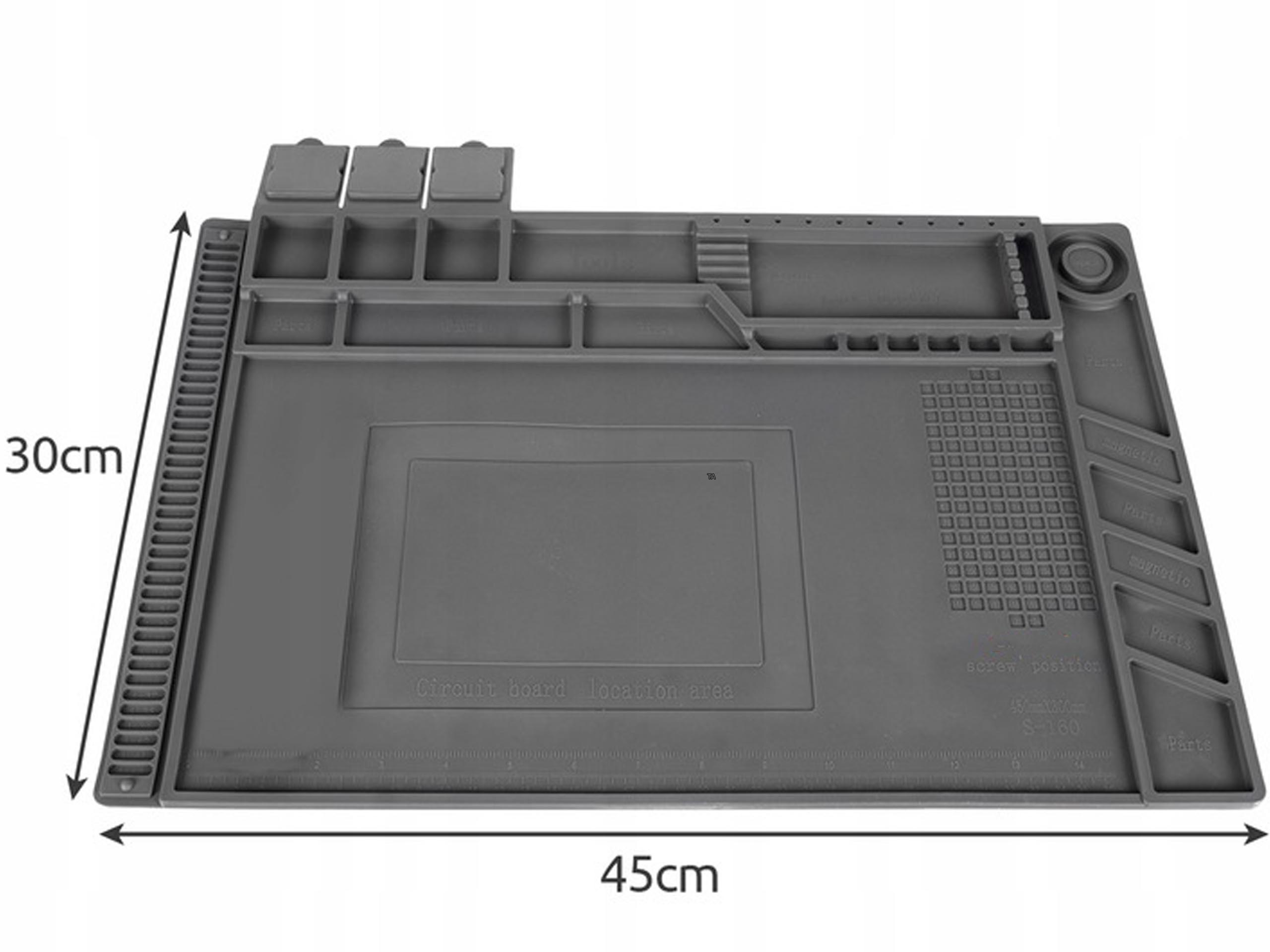 Багатофункціональний силіконовий сервіжний килимок є обов’язковим для кожного аматора та професійного ентузіаста DIY. Це значно полегшує виконання будь-якого ремонту електроніки та паяння. Стійкий до високої температури (до 500 градусів Цельсія) і деформації. Має 4 магнітні точки: для намагнічування викруток, для деталей і гвинтів, а також численні відділення та лінійну шкалу в сантиметрах і дюймах.