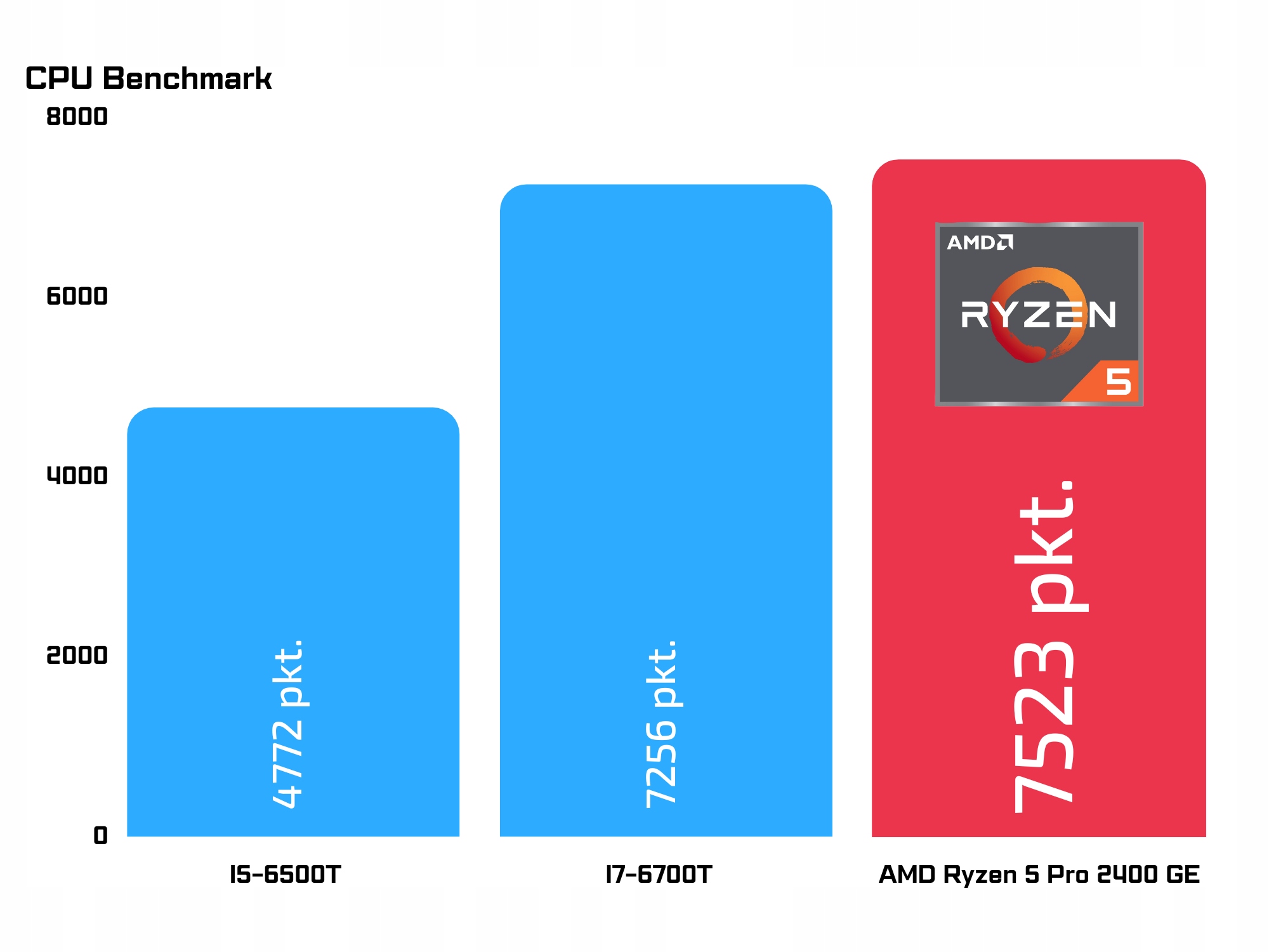 AMD Ryzen 5 Pro 2400GE є ефективним 4-ядерним процесором. Порівняно з популярним Intel Core i5-6500T, який є в багатьох мікрокомп’ютерах,Ryzen 5 2400GE працює приблизно на 60% ефективніше(на основі даних Passmark), таким чином перевершуючи процесори серії Intel Core i5 старого покоління.