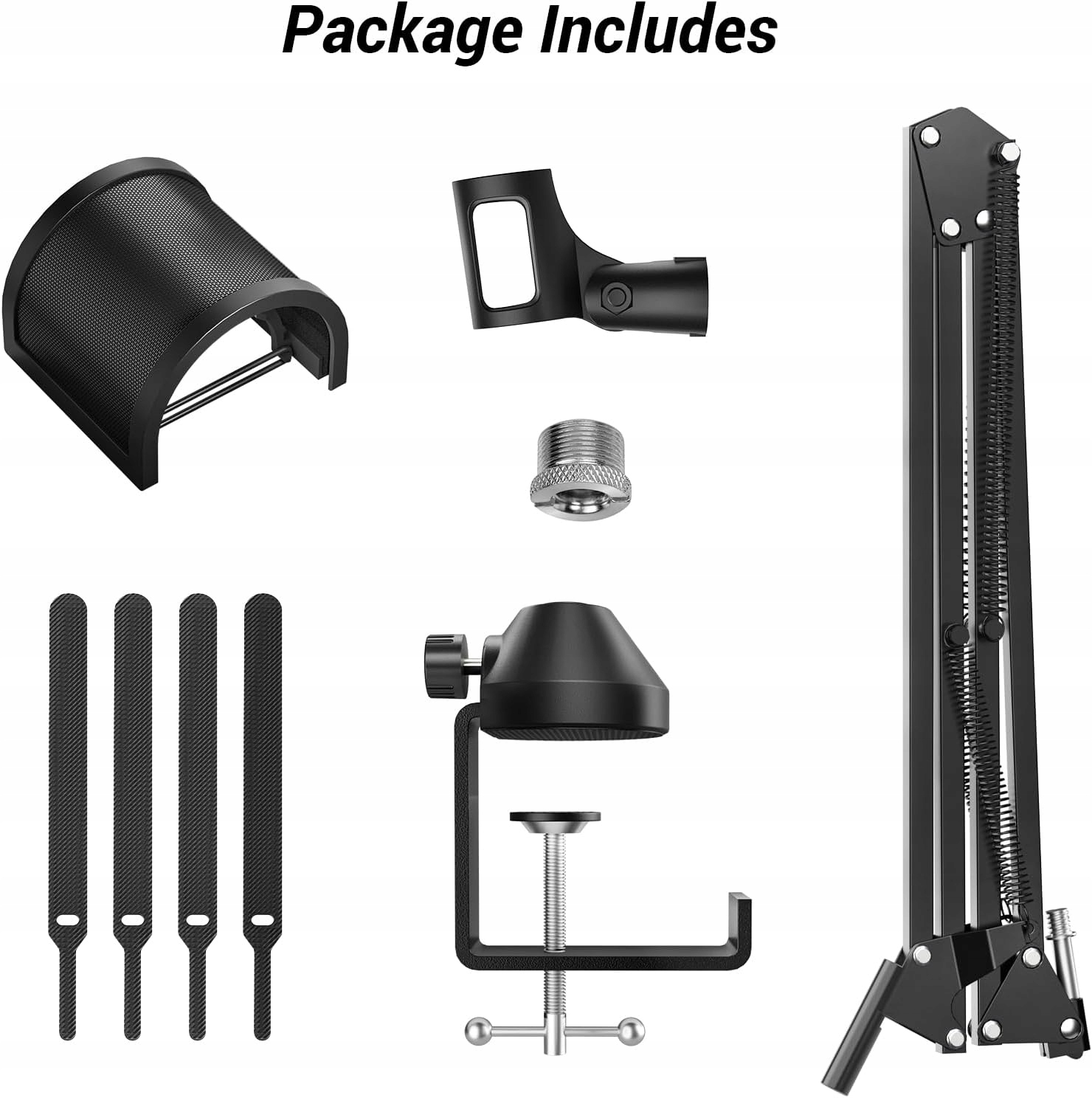 180° надвеликий поп-фільтр: комплект штатива включає вигнутий на 180° поп-фільтр, який ефективно запобігає шуму повітряного потоку під широким кутом. Він сумісний з різними типами мікрофонів із максимальним діаметром 2,95 дюйма (7,5 см), включаючи такі популярні моделі, як Blue Yeti, HyperX Quadcast, AT2020 і TONOR Q9.