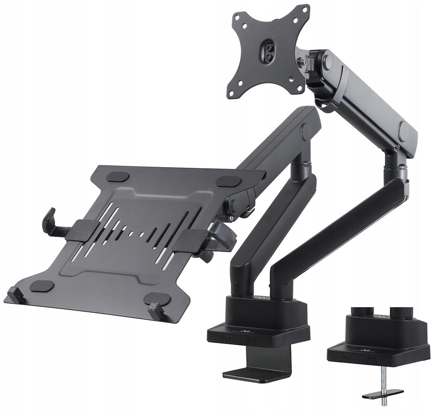 Подвійний настільний тримач MC-813 для монітора та ноутбука забезпечує великий комфорт під час роботи та оптимізує ергономіку. Завдяки регулюванню кута нахилу, можливості повороту і зміни висоти - ручка дозволяє адаптувати станцію під індивідуальні переваги. Тримач оснащений основою для ноутбука, використання такого рішення підвищує комфорт і ергономіку роботи з ноутбуком, забезпечуючи при цьому стильний зовнішній вигляд. Кронштейни виготовлені з високоякісного алюмінію та оснащені міцним монтажним затискачем, який дозволяє кріпити до стільниці чи інших плоских поверхонь, а також до отворів у стільниці. Ідеально підходить для використання, серед іншого: в офісі та вдома – без свердління отворів у столах чи стінах.