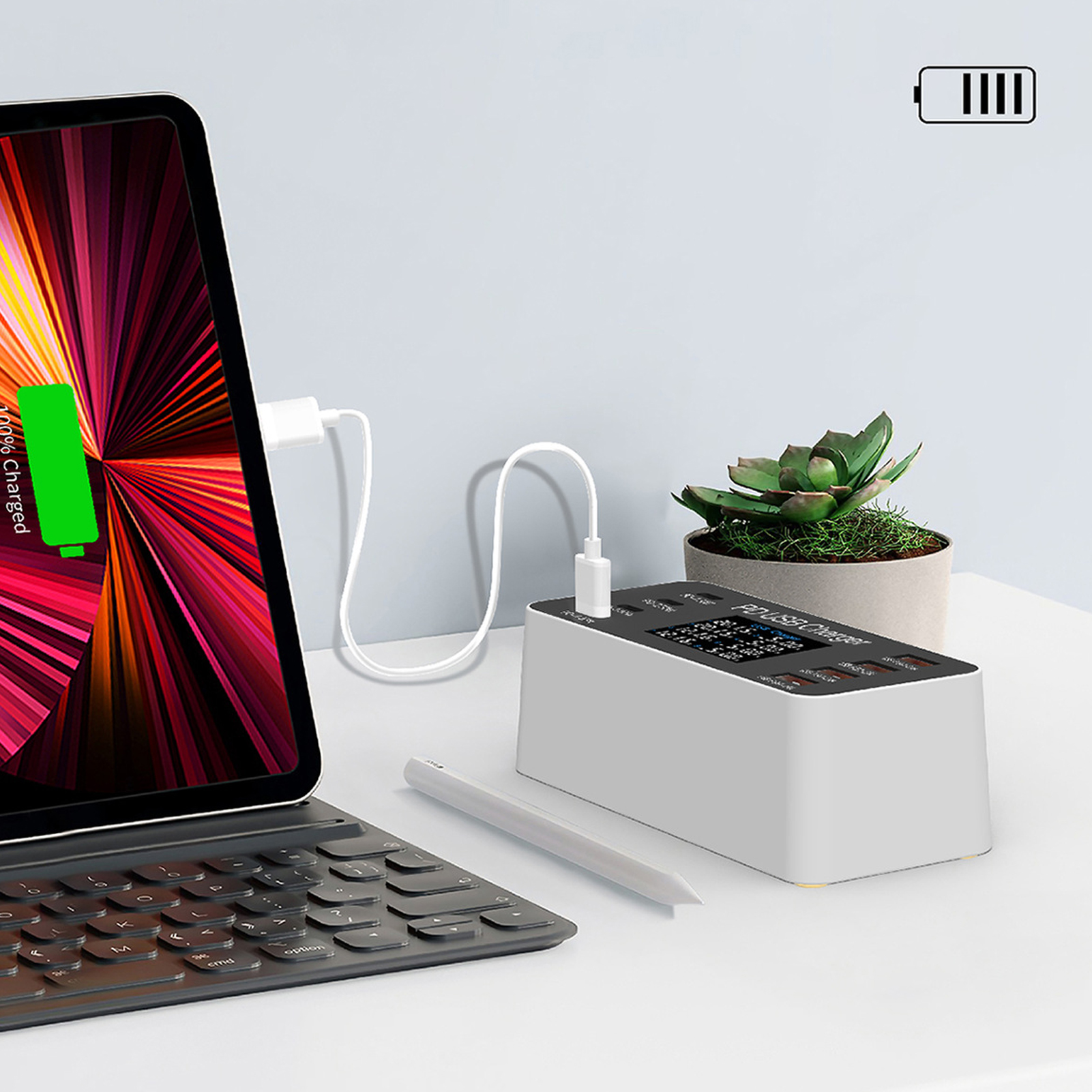 4. Дизайн цифрового дисплея: ці USB-концентратори для заряджання з цифровим дисплеєм, швидкою зарядкою PD On Smart Screen, 8 портами вихідного струму та напруги, підтримують вихідну потужність 30 Вт.