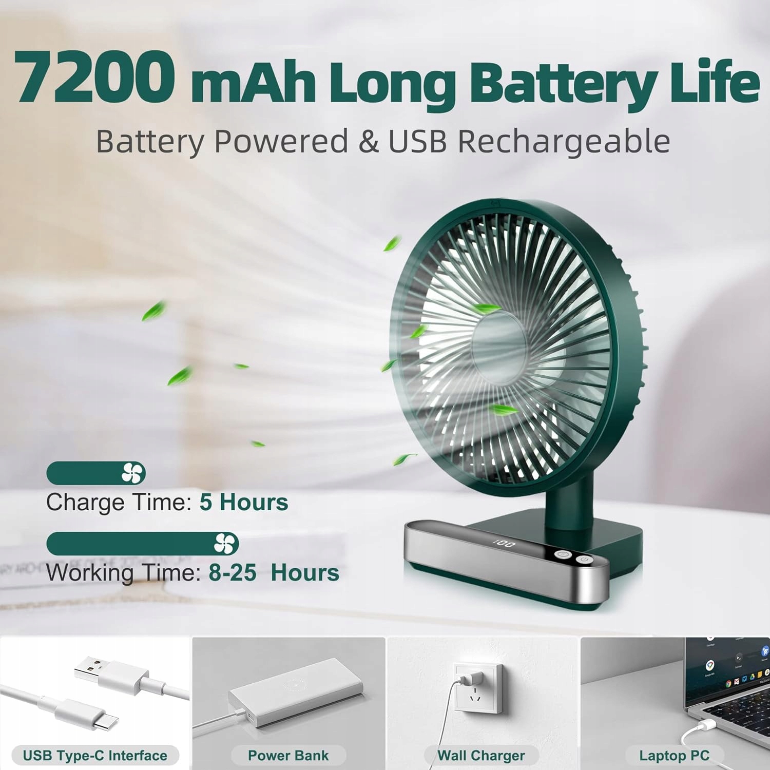 Цей акумуляторний вентилятор із вбудованими акумуляторами ємністю 7200 мАг забезпечує тривалий час автономної роботи. Заряджається протягом 7 годин і може працювати 8-25 годин (через різну швидкість вітру корисний час збільшується). USB-кабель, що входить у комплект, сумісний із усіма USB-портами, такими як ПК/ноутбуки, комп’ютери, мобільні адаптери живлення, адаптери змінного струму, автомобільні зарядні пристрої та будь-які інші USB-адаптери живлення.
