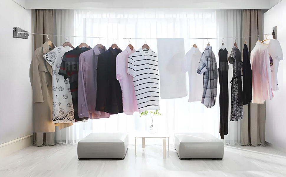 Висувна мотузка має дизайн, що запобігає провисанню, і оснащена замком і поворотним натягувачем, який дозволяє регулювати натяг залежно від розміру вішалки та ваги вашого одяг. Якщо ви вішаєте багато одягу, і він висить, цю проблему можна вирішити, зафіксувавши їх, а потім повернувши натяжний шнур.