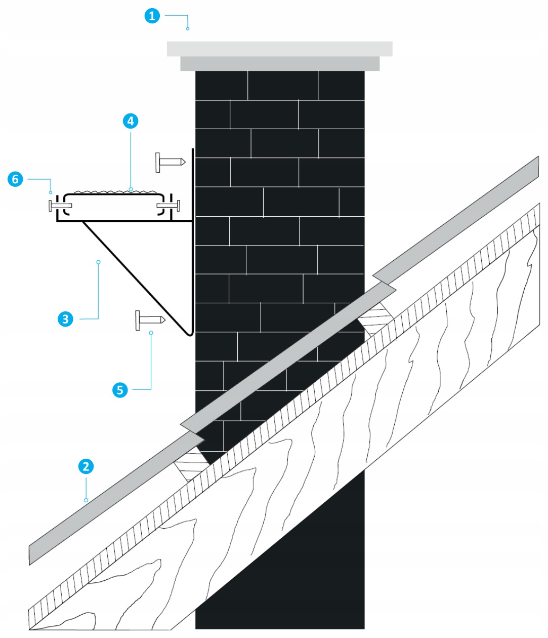 Повна лавка для сажотруса SCI призначена для кріплення до стіни, особливо до димоходу стіна (2). Повний стіл для сажотруса складається з опори SCI (3) і платформи для сажотруса (4). Кронштейн (3) необхідно прикріпити до стінки димоходу (1) за допомогою бетонних шпильок (5) діаметром 8 мм. Платформу для сажотруса (4) слід прикрутити до кронштейнів гвинтами M8 x 20 мм (6). Приклад схеми складання повної лавки для сажотрусів SCI показано на кресленні.