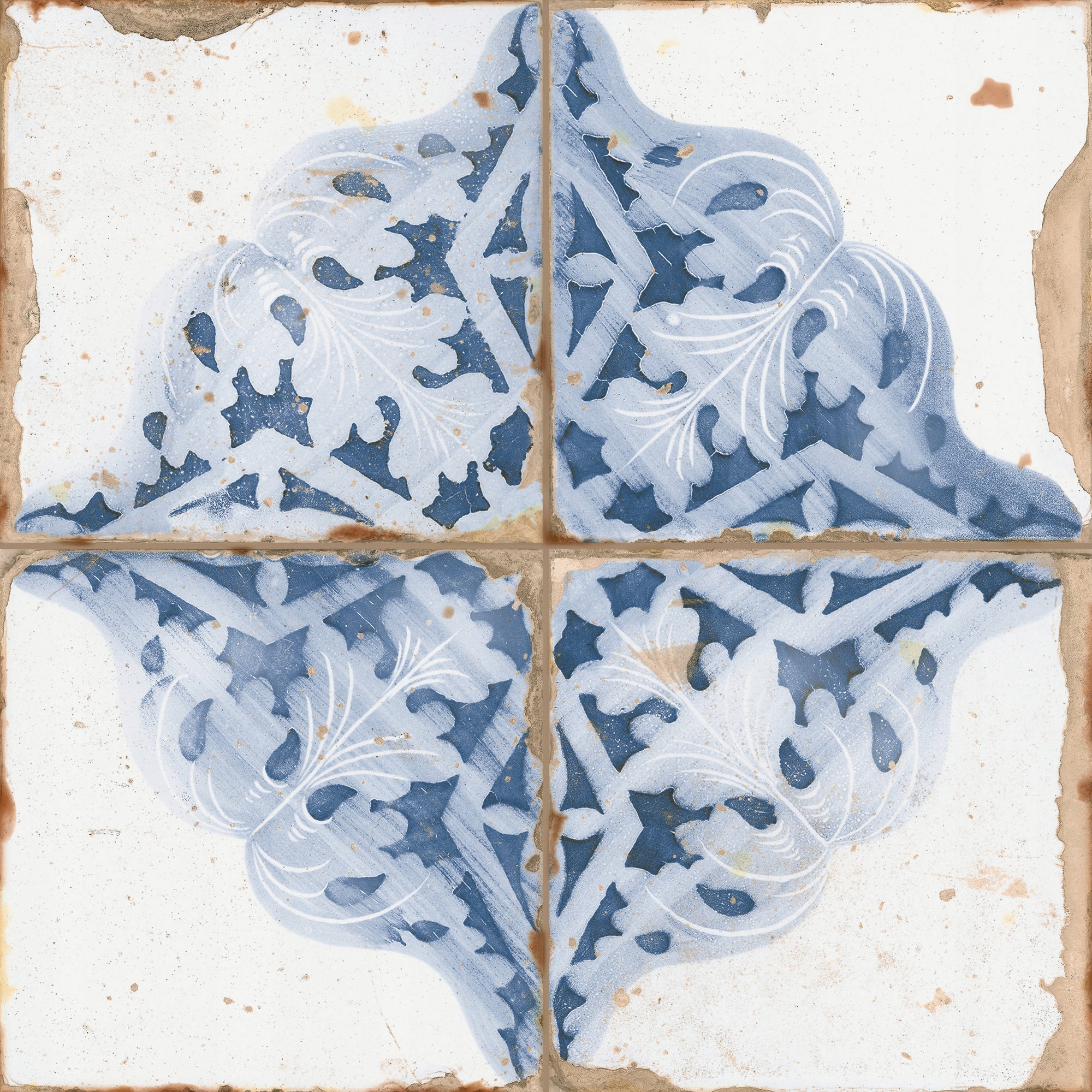 Центральним елементом кожної з чотирьох частин плитки є красивий рослинно-геометричний візерунок, який захоплює різноманітністю відтінків синього і синього. Ці кольори ідеально поєднуються зі світлим, майже білим фоном плитки, що надає всьому вигляду надзвичайно елегантний і гармонійний. Ефект старіння, використаний у цій колекції, додає плитці неповторного шарму - нерівні краї, тонкі потертості та бежеві плями на поверхні плитки надають їй потертого вигляду, наче це частина історії, привносячи з це дух старих часів. p>