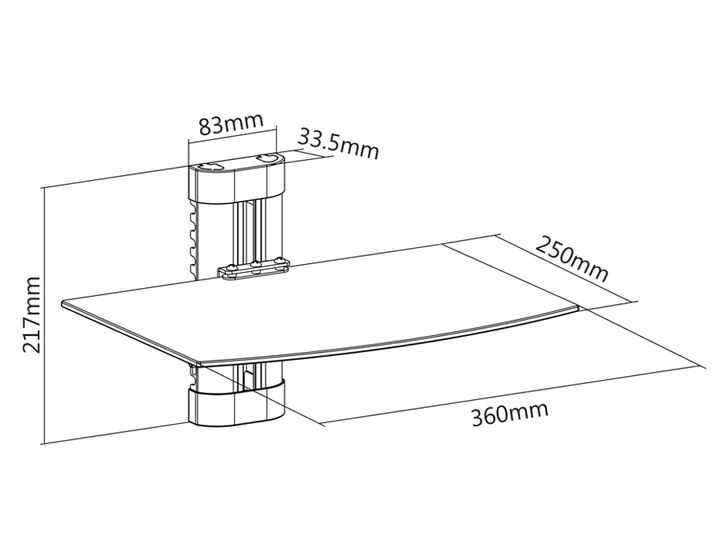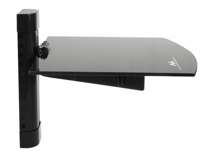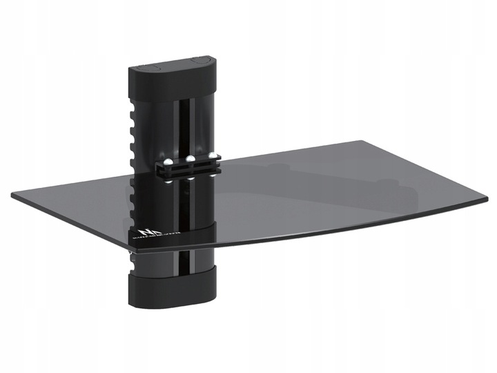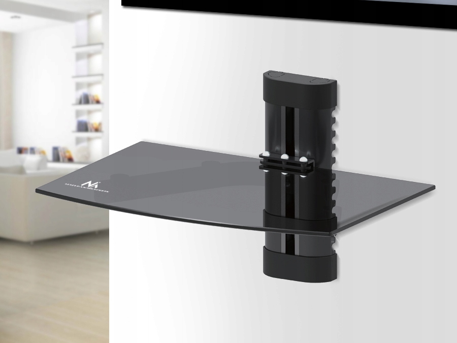 Фірмовий тримач для обладнання, наприклад, DVD, ТВ-тюнера, приставки та ін. Скляні полиці виготовлені із загартованого скла товщиною 5 мм . Вся опорна конструкція виготовлена з алюмінію, завдяки чому вся конструкція полиці легка, але в той же час дуже стійка. Полиця маєсистему приховування кабелю, що покращує естетичність установки.