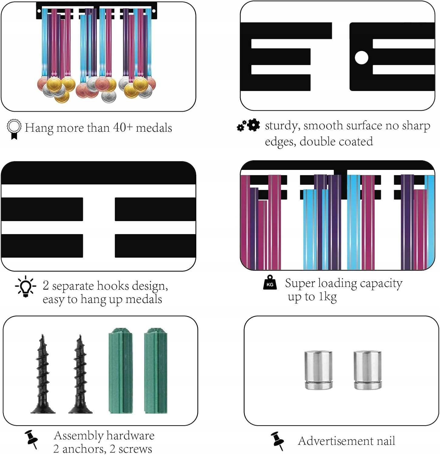 У тримачі є 2 ряди та місце для понад 20 медалей, що дозволяє зберігати та вручати нагороди в порядку. Продукт міцний, стійкий до корозії та простий у встановленні.