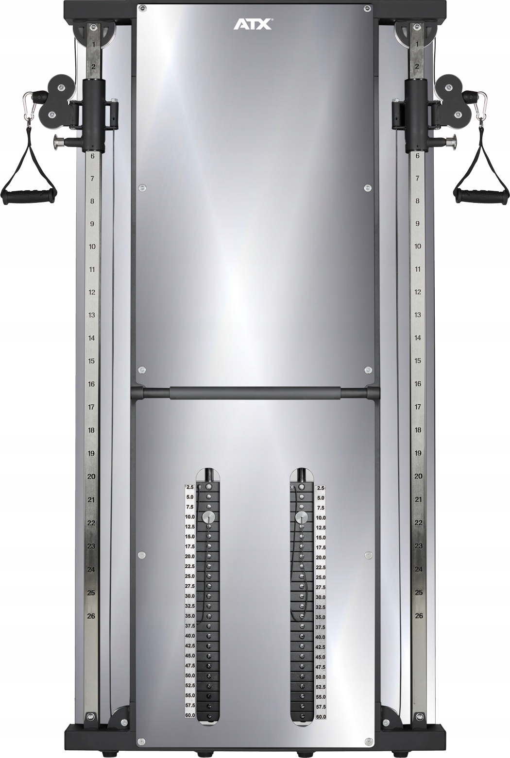Настінна станція ATX® WFT-M2500 Dual Pulley із дзеркалом | являє собою ультраплоску конструкцію, яка кріпиться до стіни на відстані всього 11 см. Завдяки двом незалежним канатним підйомникам із 2 вагами по 60 кг ви можете відчути найефективніші тренування всього тіла. Завдяки передній дзеркальній кришці з акрилового скла ви завжди маєте 100% контроль над правильним виконанням вправи, що є надзвичайно цінним для ваших оптимальних результатів тренувань!