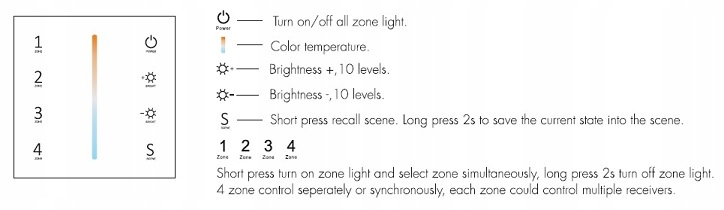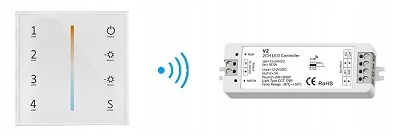 T22W — це настінна світлодіодна панель, призначена для бездротової взаємодії зі світлодіодним приймачем, який керує освітленням із змінною колірною температурою, наприклад стрічками CCT. Зв'язок із світлодіодним приймальним пристроєм здійснюється через радіочастоту 2,4 ГГц. Панель дозволяє вмикати/вимикати і регулювати яскравість освітлення. За допомогою сенсорного повзунка в центрі пристрою можна регулювати колірну температуру в діапазоні 2700-6500K. Сенсорні поля панелі дозволяють точно контролювати інші його функції. Пульт забезпечує керування освітленням ККТ в одній із чотирьох зон. Його робочий діапазон становить 10 метрів і може бути розширений завдяки функціям автоматичної передачі та автоматичної синхронізації приймачів. Для живлення панелі достатньо двох батарейок ААА. Його виготовлено в сучасному корпусі з чорного скла.