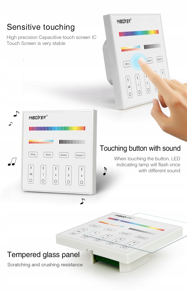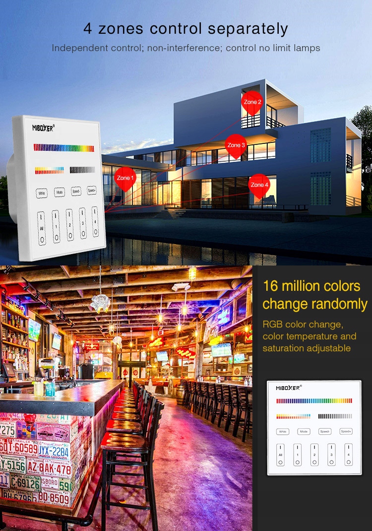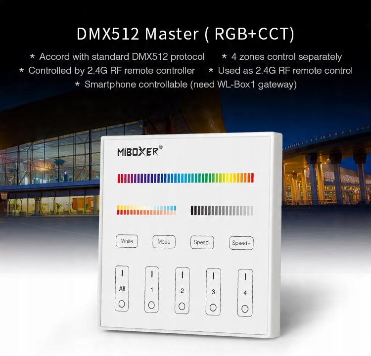 Настінна світлодіодна панель - RGB+CCT - 4 зони - DMX512 - на основі комунікаційної системи управління DMX512. Настінна панель живиться безпосередньо від мережі 230 В змінного струму. Кожна з доступних зон має постійно встановлені адреси зв’язку для окремих каналів R/G/B/CW/WW, які включені в посібник користувача. Встановлюється на стандартну коробку fi60