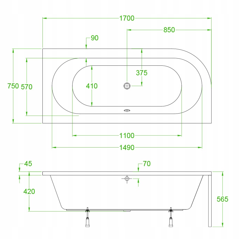 - Чотири регульовані ніжки дозволяють вирівнювати ванну, що важливо для рівномірного відтоку води та використання на нерівних поверхнях.