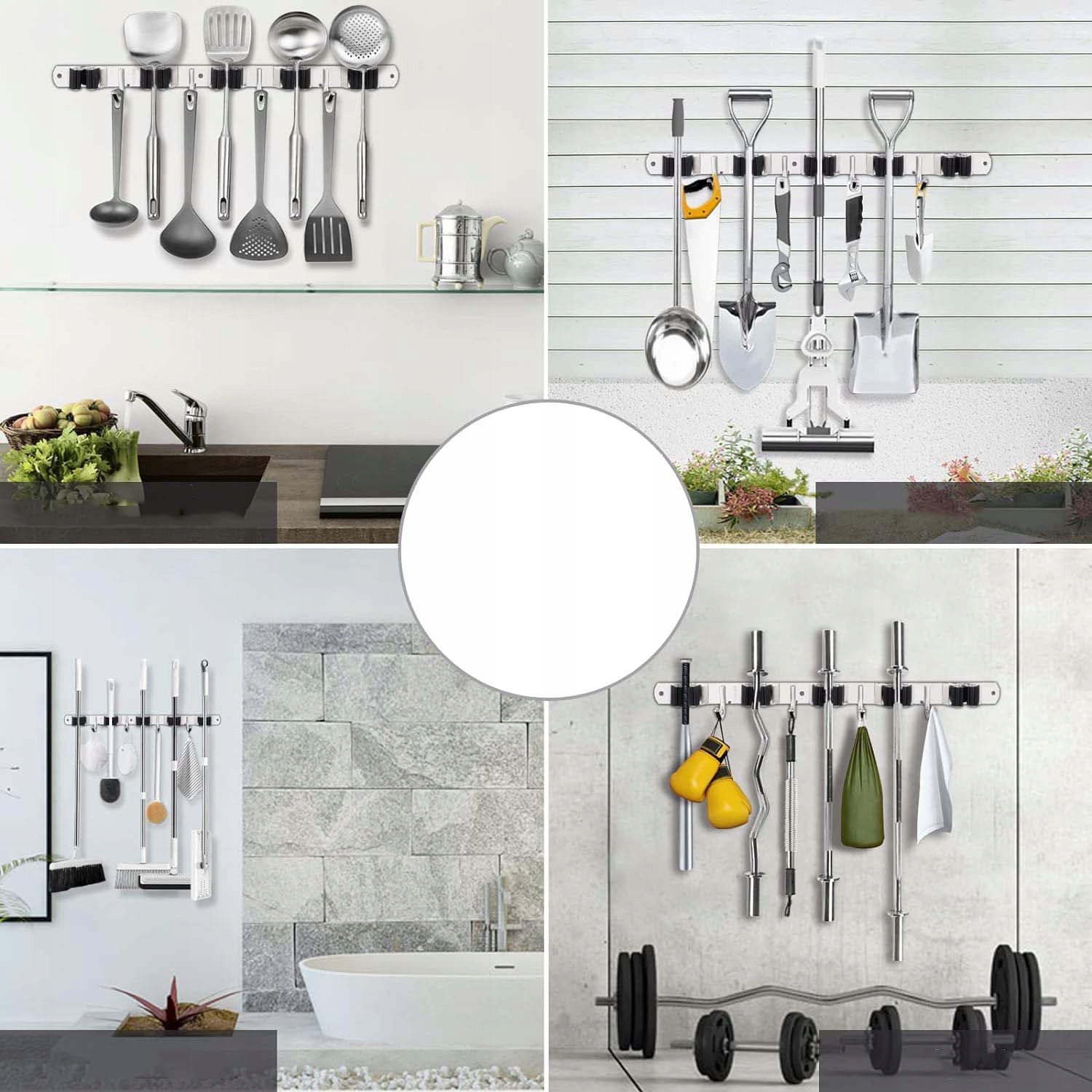 - Цей тримач для мітли пропонує загалом 9 місць для підвішування інструментів завдяки 5 отворам і 4 гачкам, заощаджуючи максимум місця.