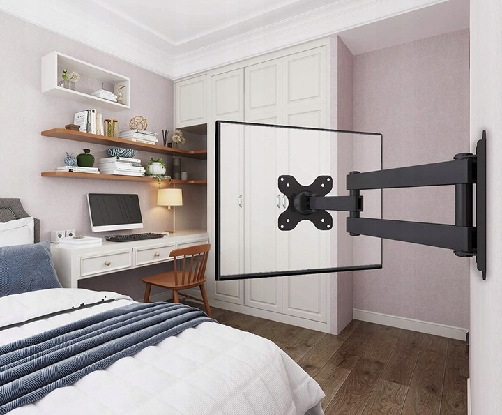 Удосконалена шарнірна система: Настінне кріплення для телевізора та монітора має широкий кут повороту від -180° до +180°, щоб задовольнити ваші різноманітні потреби перегляду; Він висувається на 38 см від стіни і втягується на 4,75 см для економії місця. Телевізор можна легко та швидко нахиляти.