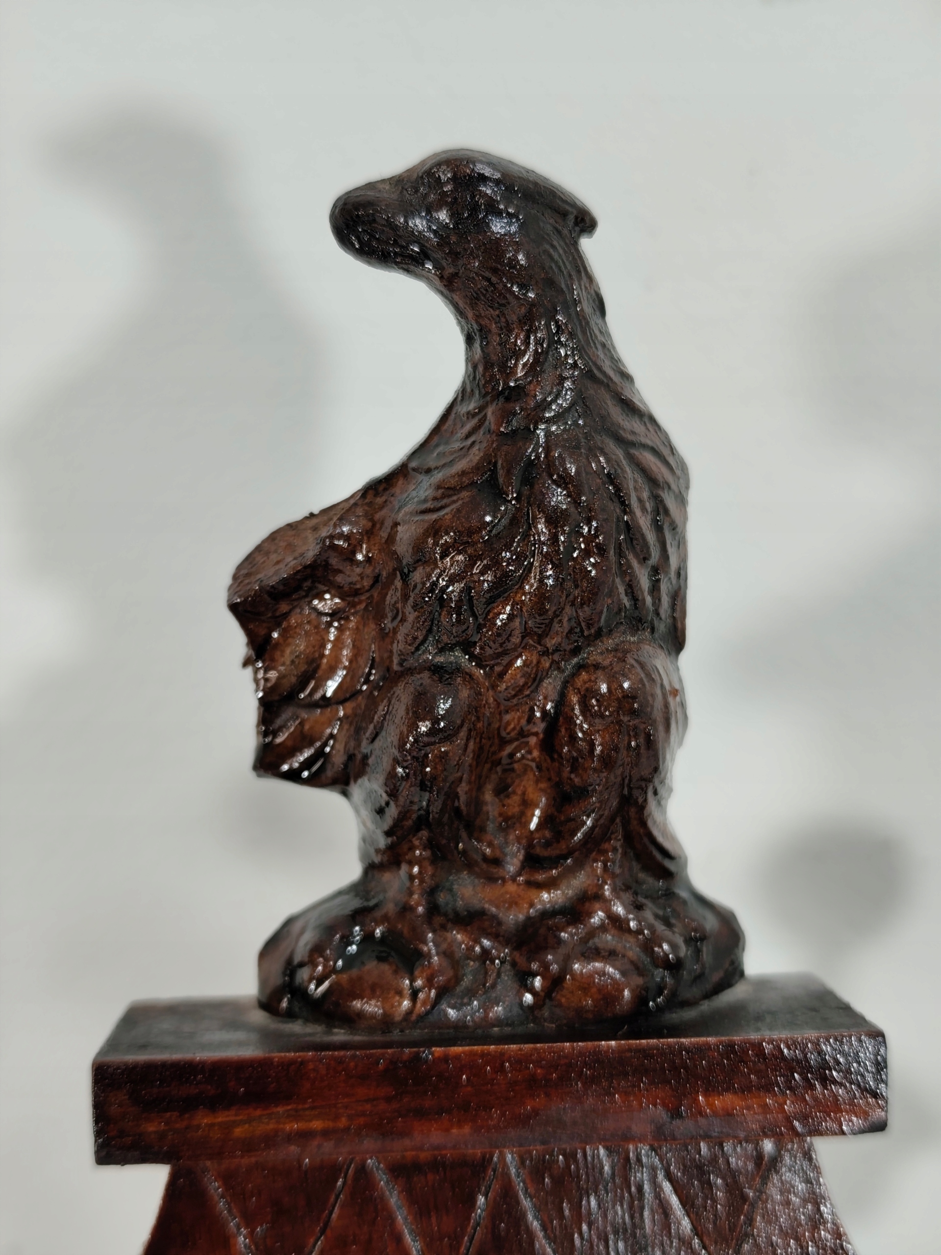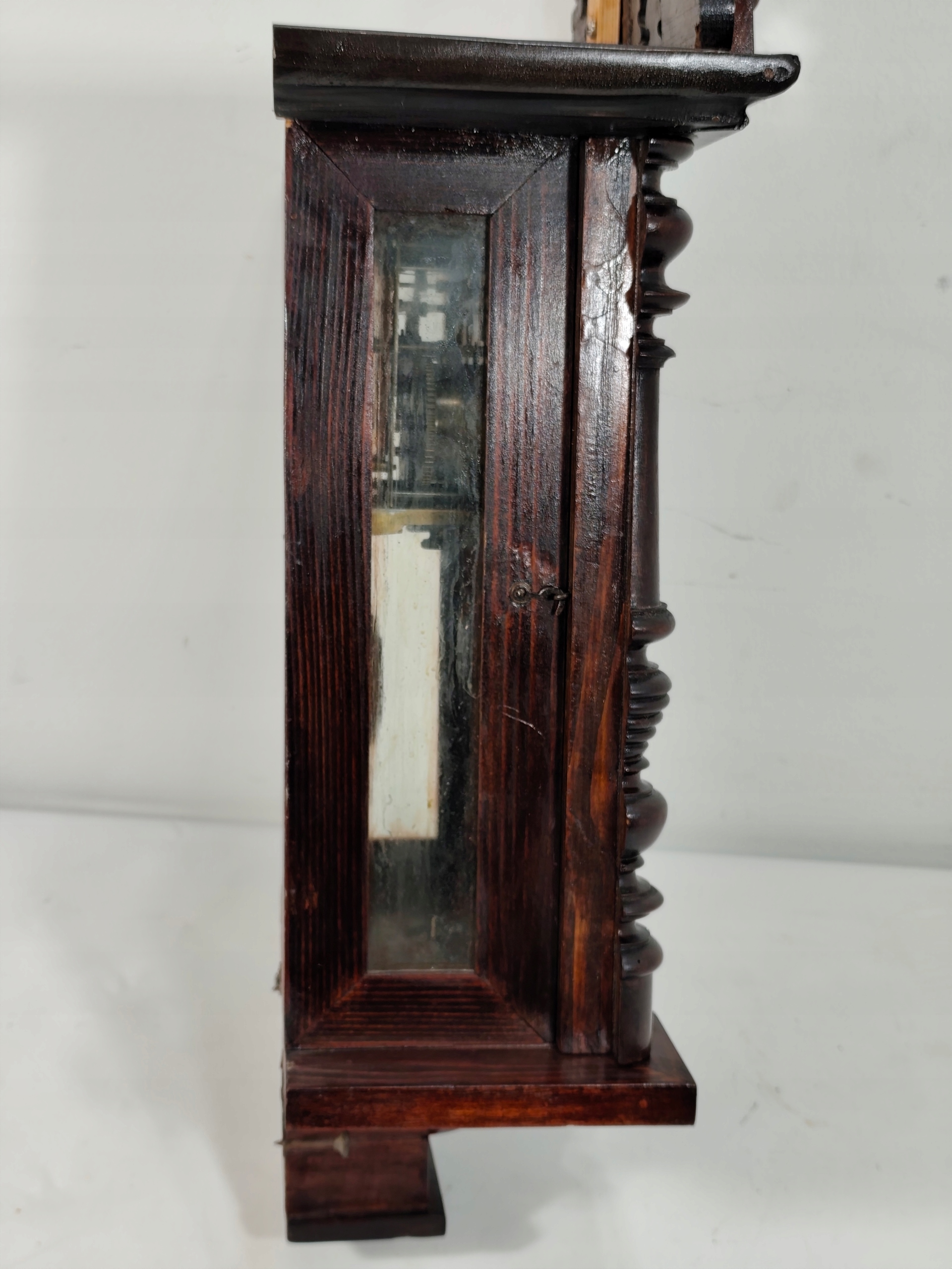 Старовинний дерев'яний настінний годинник із зображенням орла. Годинник має характерний, декоративний корпус з різьбленими елементами. Завдяки стильному зовнішньому вигляду стане елегантною прикрасою будь-якого інтер'єру.