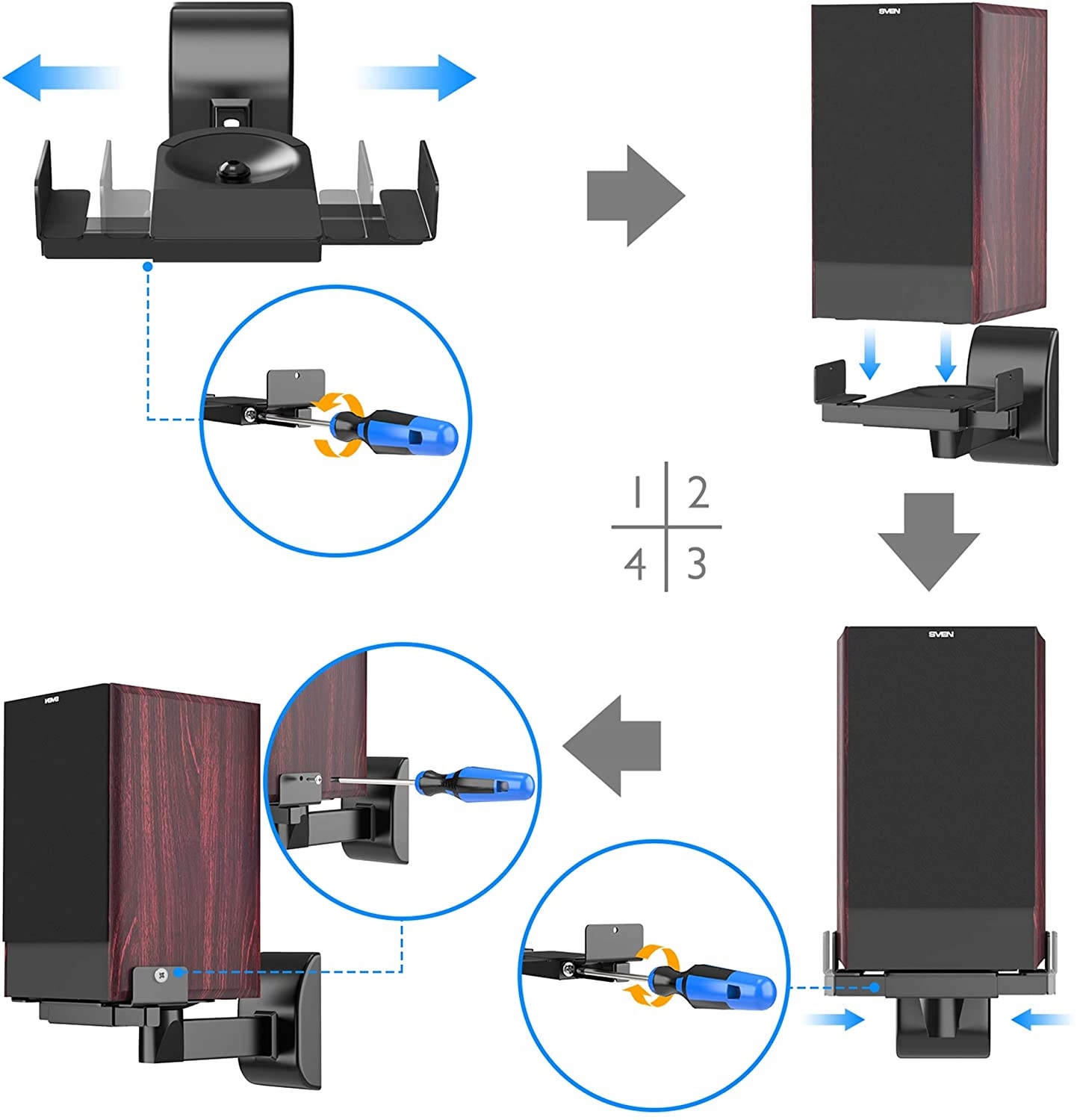 Регульовані бічні затискачі дозволяють встановлювати динаміки шириною від 135 мм до 275 мм і глибиною до 23 мм; нахил 8 градусів вгору/вниз; Поверніть на 90 градусів ліворуч/праворуч.
