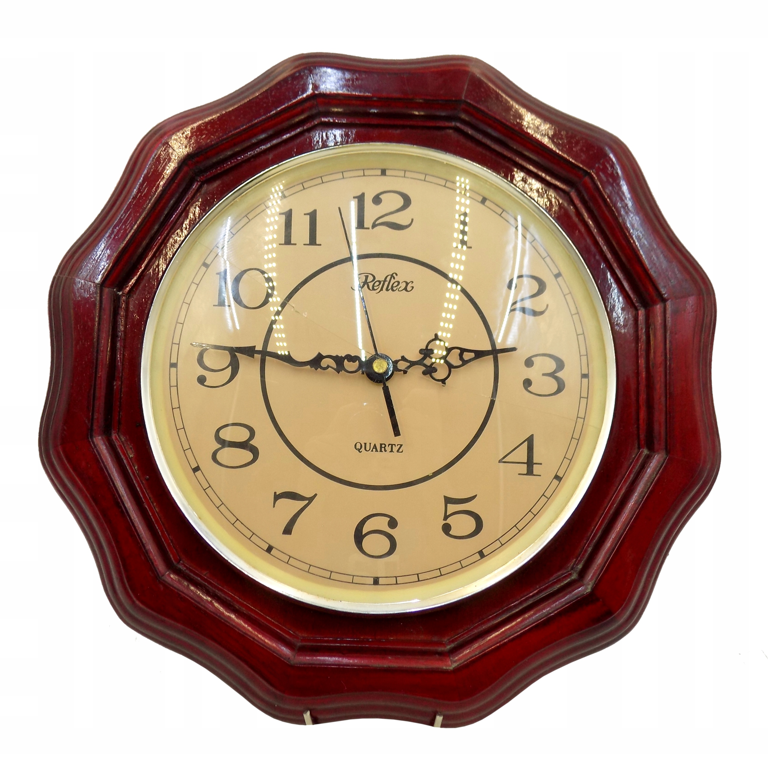 Годинник настінний в дерев'яному корпусі. Розміри; висота 34 х 34 х 6 см. Розбите скло годинника. Робочий кварцовий механізм. Кожен годинник обладнано новою лужною батареєю Kodak.
