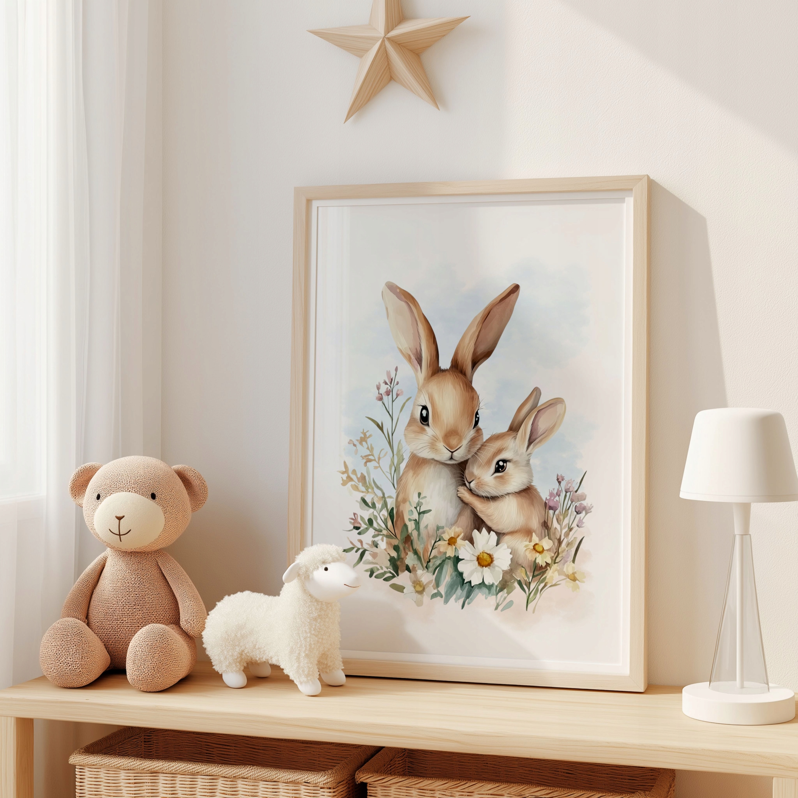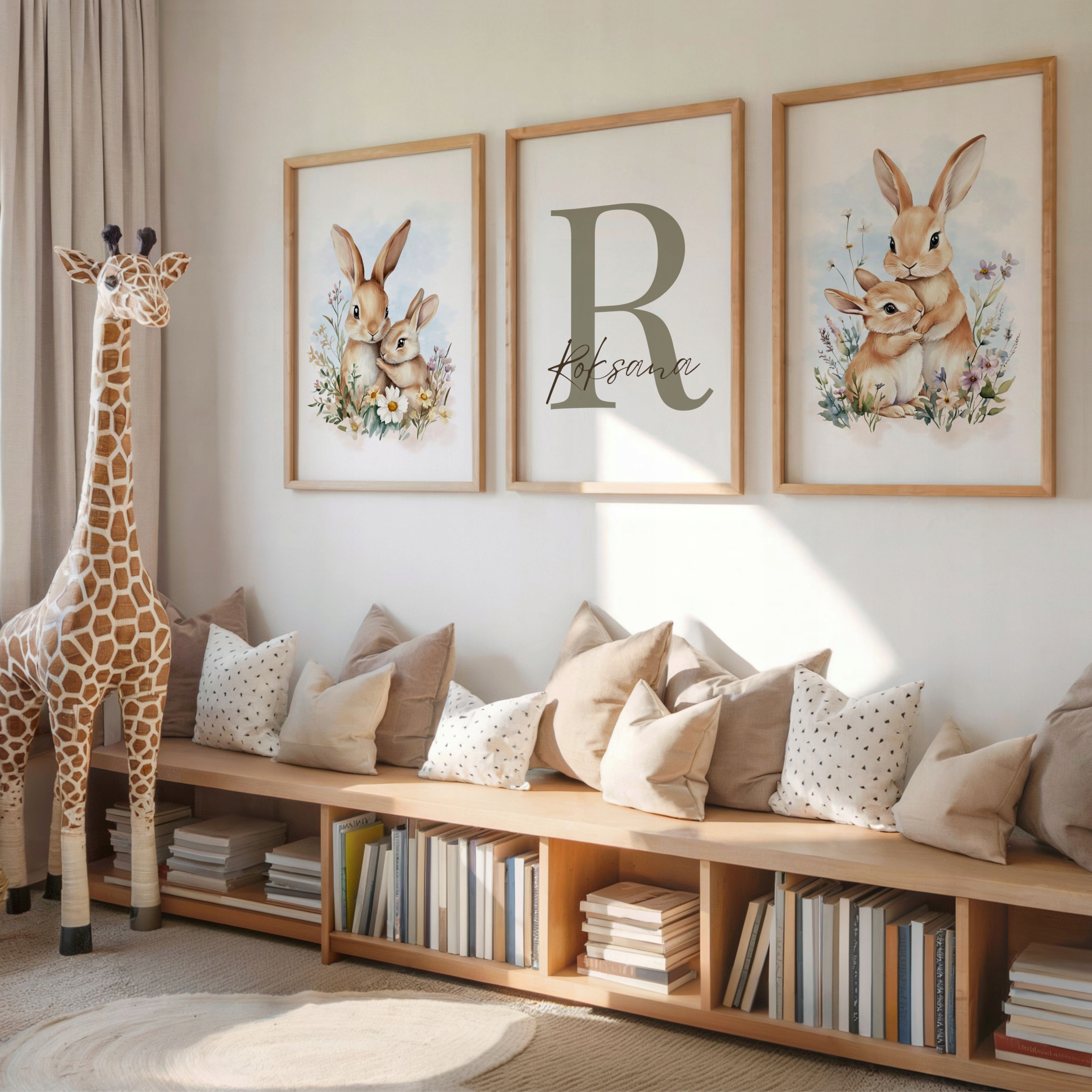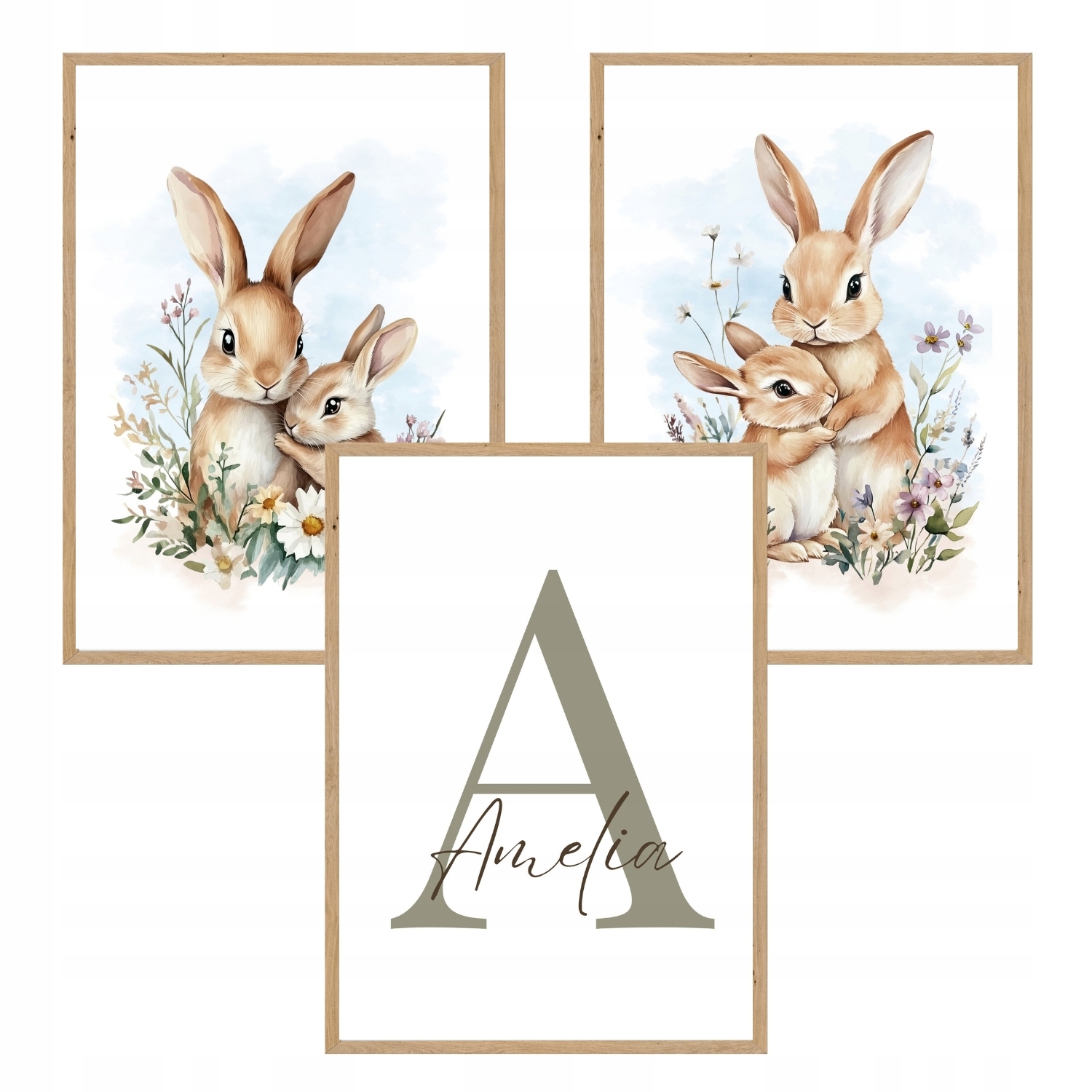 Цей чарівний набір із 3 постерів із зайчиками серед квітів — це поєднання тонких ілюстрацій і стильної персоналізації, що створює неповторну атмосферу в дитячому просторі.