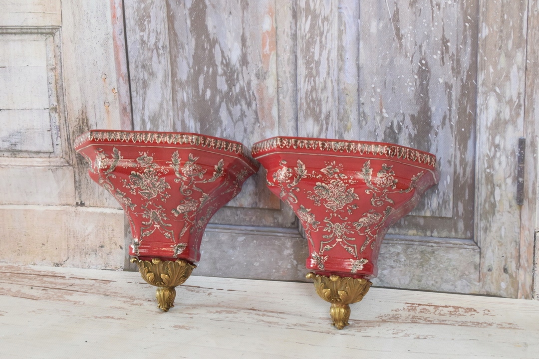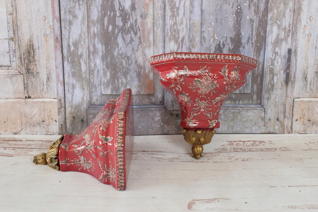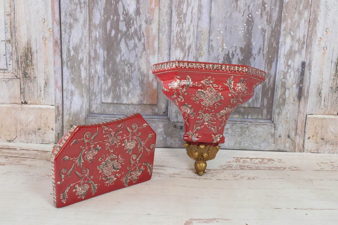 Настінні полиці для консолі червоного кольору - декор порцеляни + бронзовий знак.