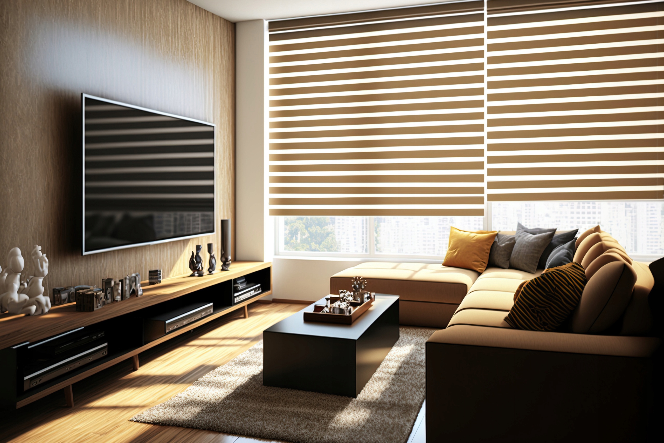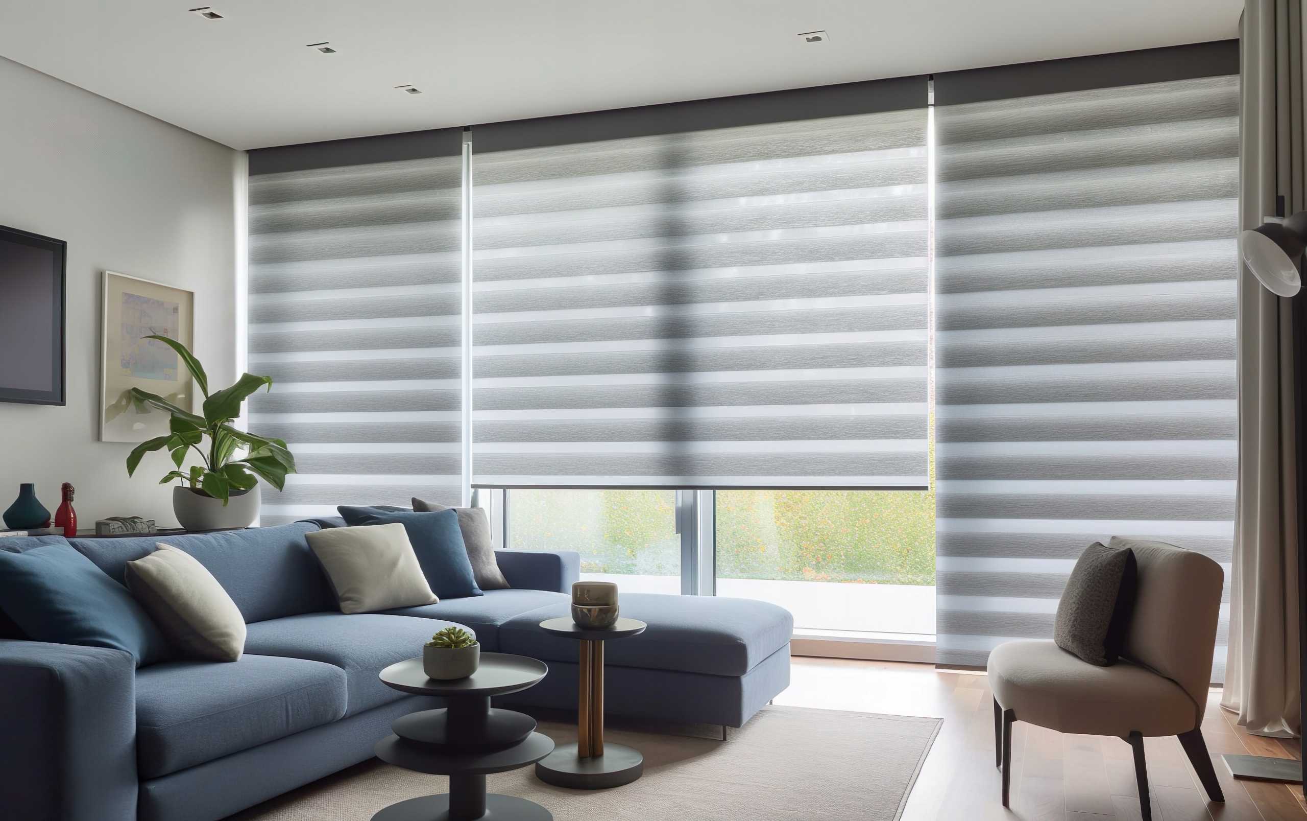 ✅ Рулонна штора з тканиною День Ніч, яку можна регулювати b >пропускання світла завдяки двом паралельним шарам матеріалу з чергуванням смуг (темні та прозорі)