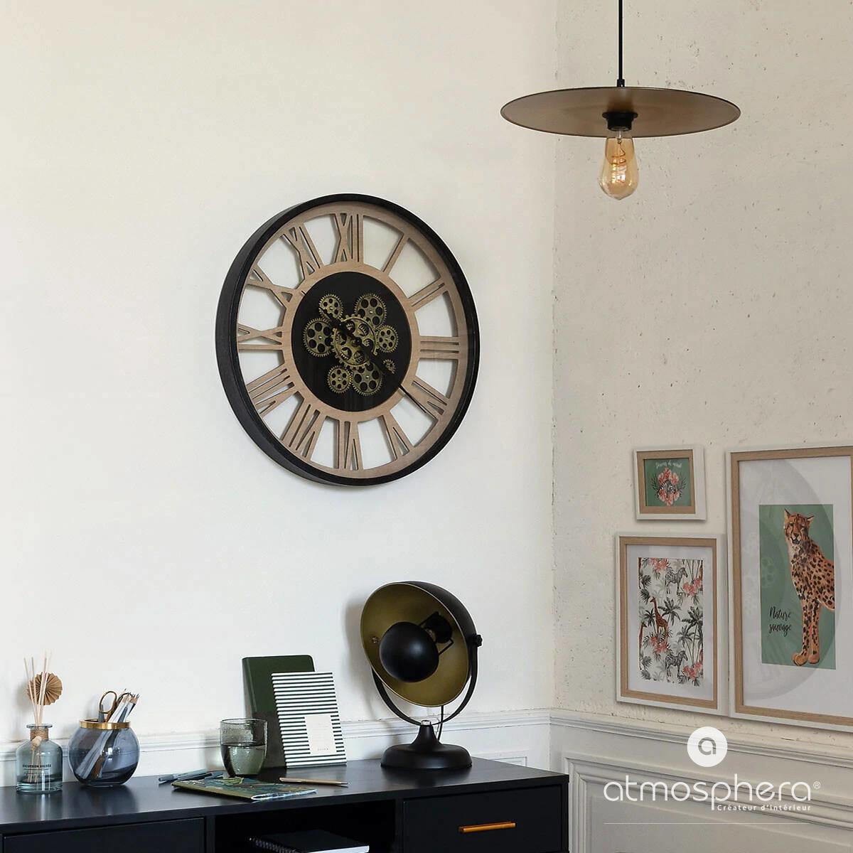 Стінний годинник французького бренду атмосфера Créateur d'Térieur - це продукт з цікавим, унікальним зовнішнім виглядом . Годинник має видимий механізм, який можна спостерігати через циферблат з відкритим робіт. Рівномірний тик механізму, що працює всередині механізму, має заспокійливий і розслабляючий ефект. Настінний годинник горища має класичну форму кола.