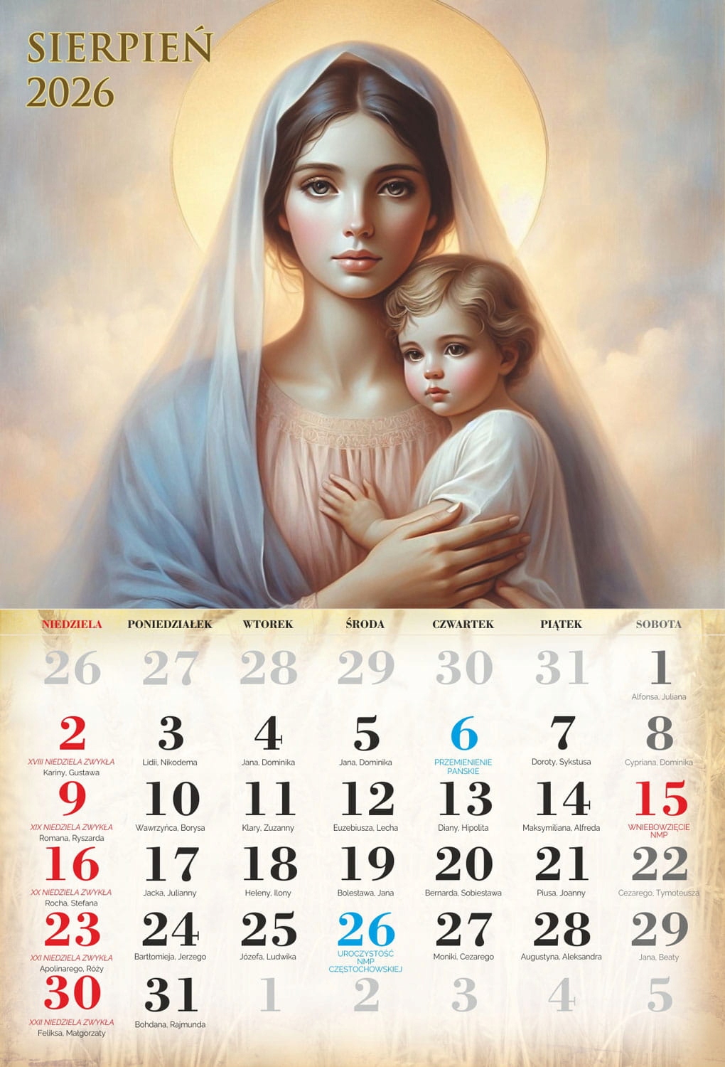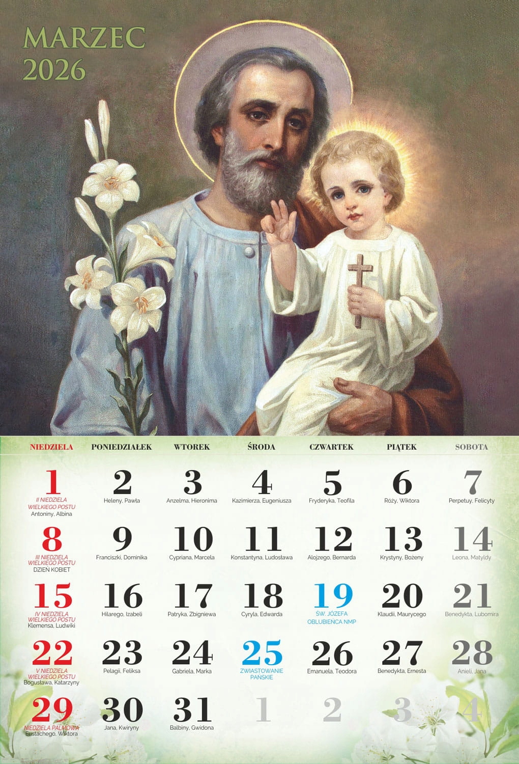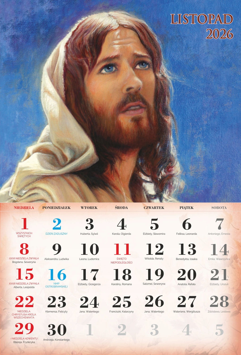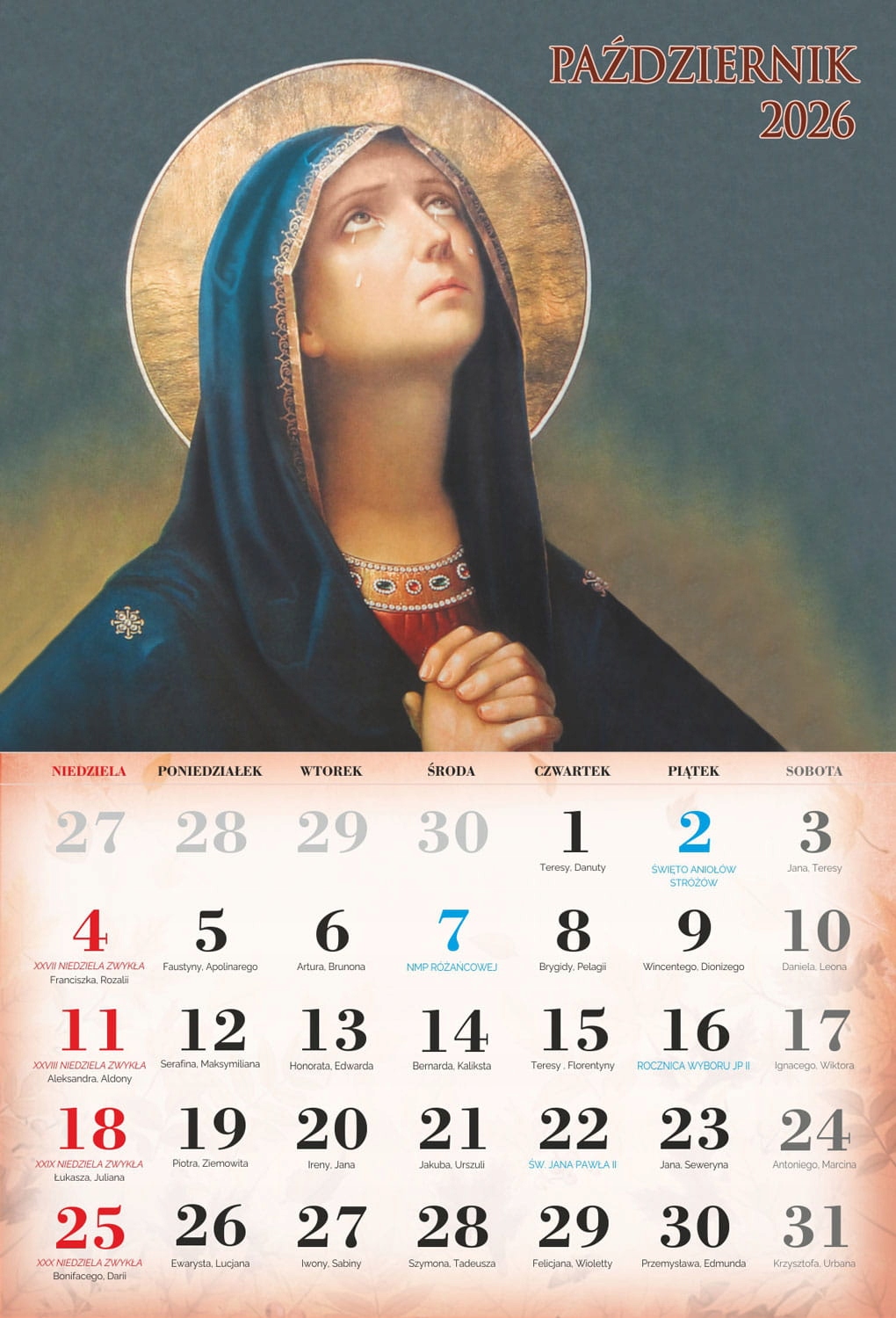 4 На сторінках індивідуальних місяців ви можете знайти Пресвяту Діву Марію, святого Йосифа та Ісуса Христа. Католицький календар 2026 року характеризується приглушеною графікою, акуратно підкреслюючи особливості всіх святих, знайдених на окремих картках календаря. Продукт, доступний у нашій пропозиції, чітко описав католицькі свята, які сприятимуть орієнтації на церконії церковних церемоній.- чіткий календар