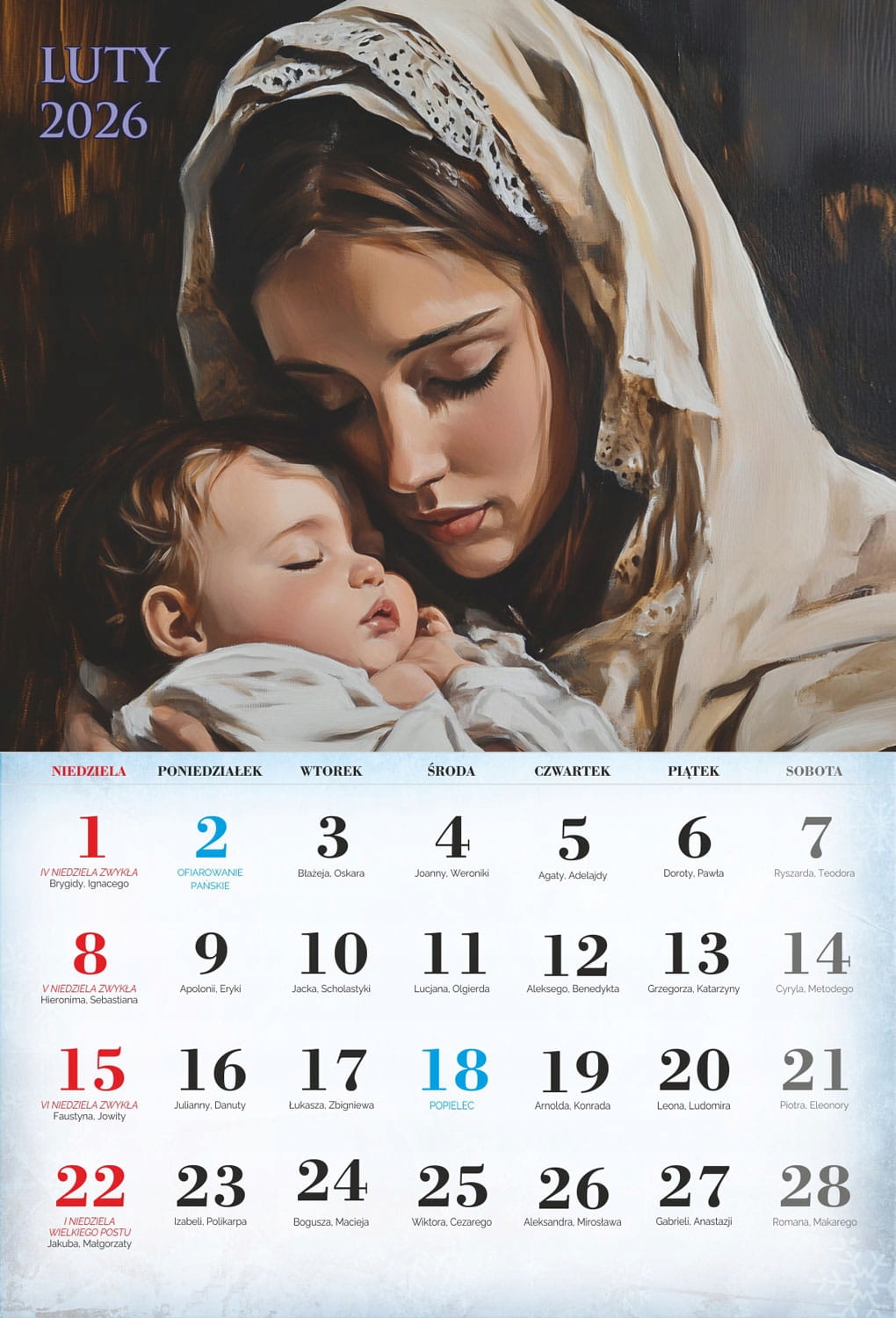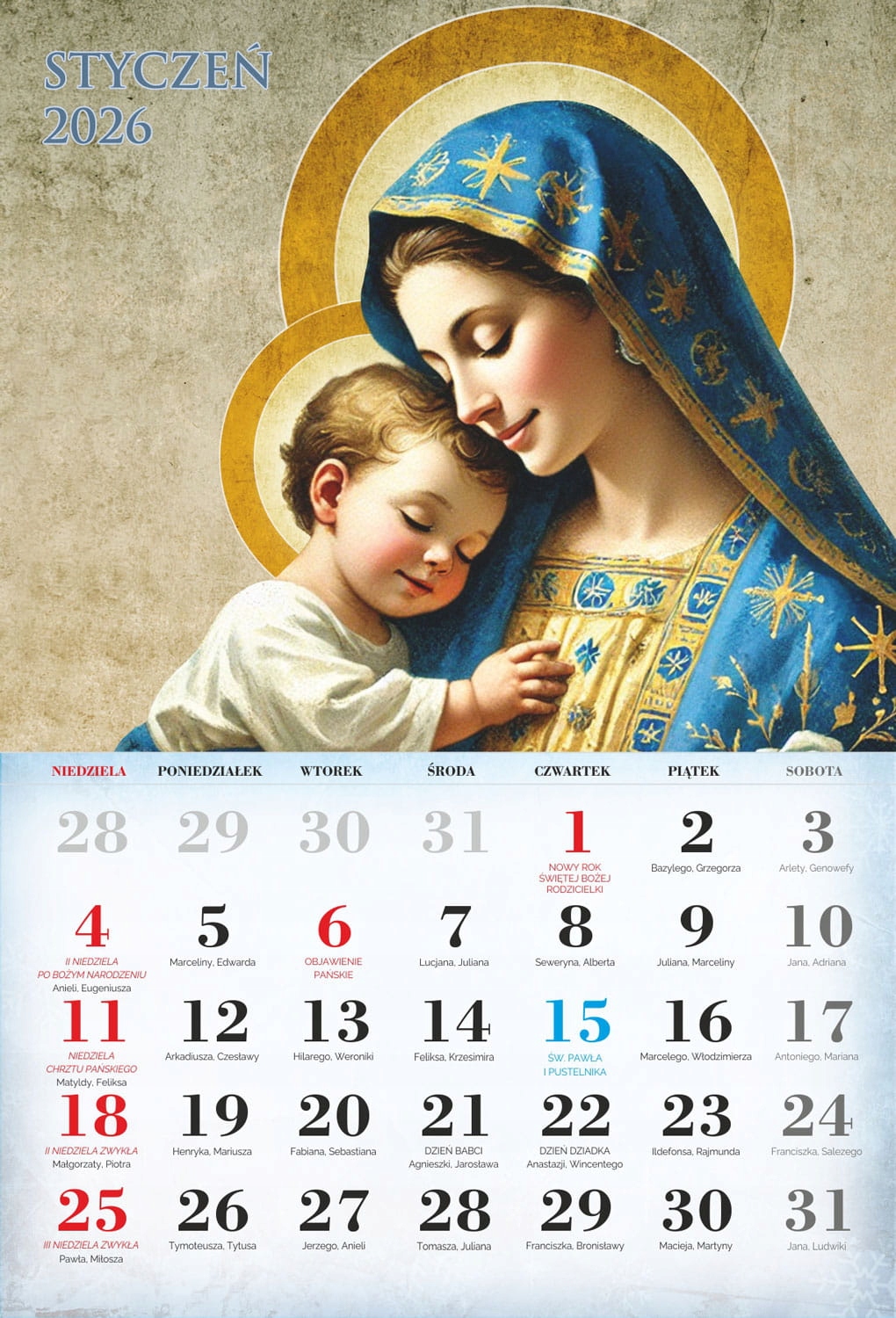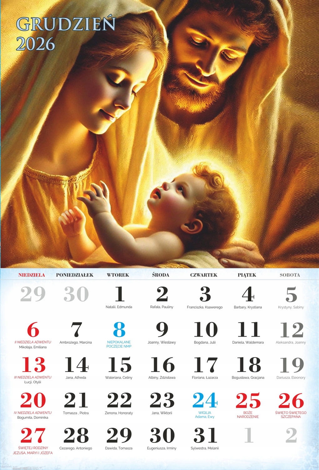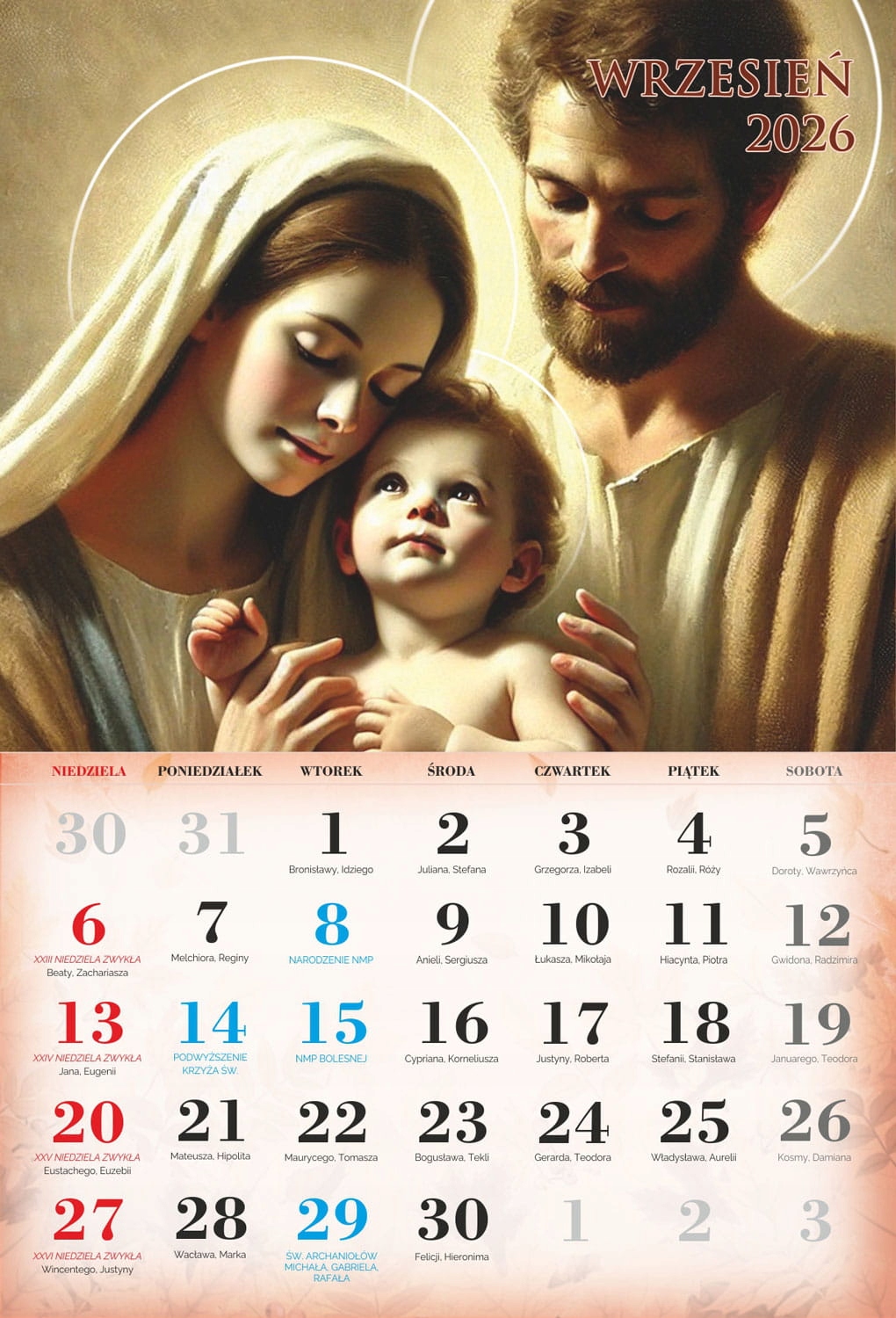 4 На сторінках індивідуальних місяців ви можете знайти Пресвяту Діву Марію, святого Йосифа та Ісуса Христа. Католицький календар 2026 року характеризується приглушеною графікою, акуратно підкреслюючи особливості всіх святих, знайдених на окремих картках календаря. Продукт, доступний у нашій пропозиції, чітко описав католицькі свята, які сприятимуть орієнтації на церконії церковних церемоній.- чіткий календар