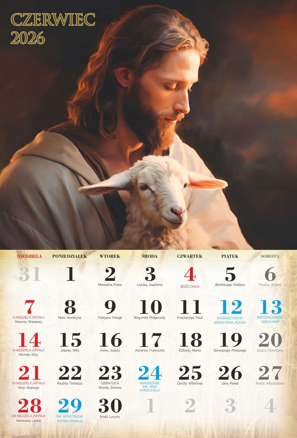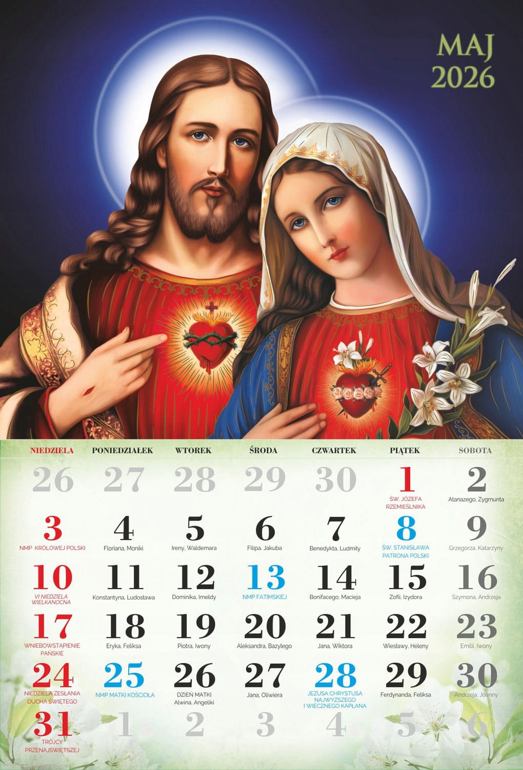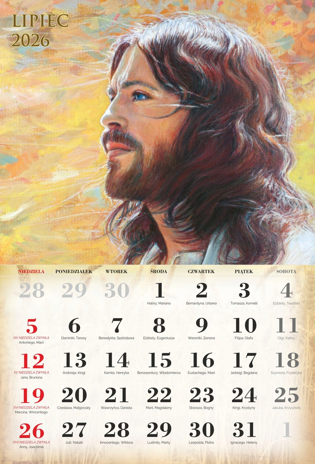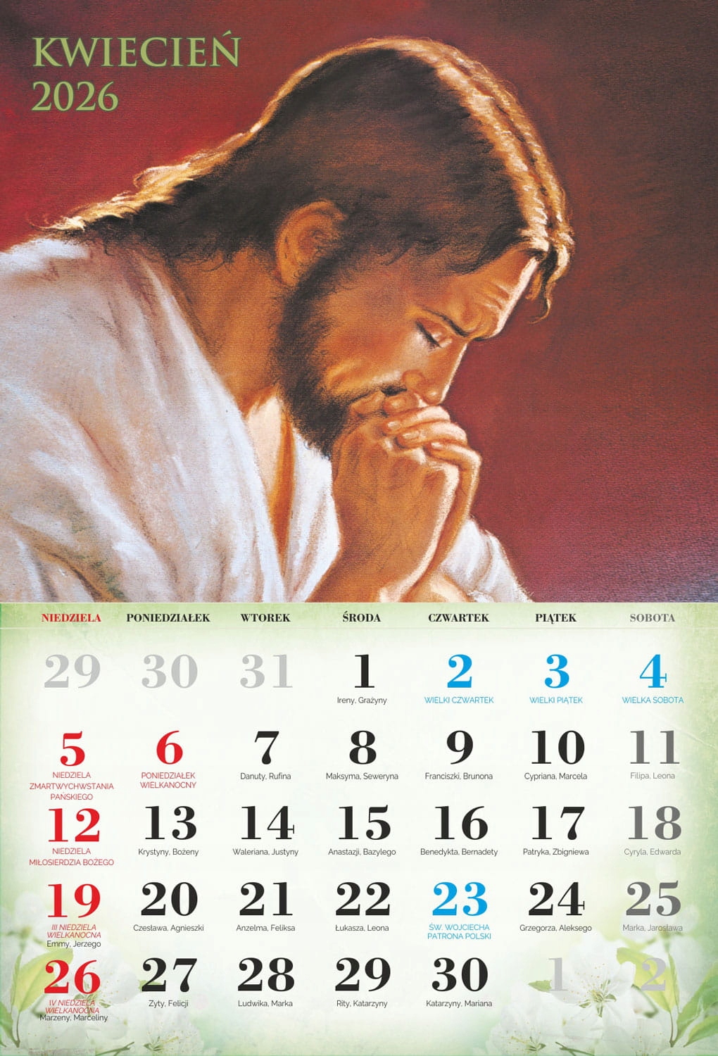 4 На сторінках індивідуальних місяців ви можете знайти Пресвяту Діву Марію, святого Йосифа та Ісуса Христа. Католицький календар 2026 року характеризується приглушеною графікою, акуратно підкреслюючи особливості всіх святих, знайдених на окремих картках календаря. Продукт, доступний у нашій пропозиції, чітко описав католицькі свята, які сприятимуть орієнтації на церконії церковних церемоній.- чіткий календар