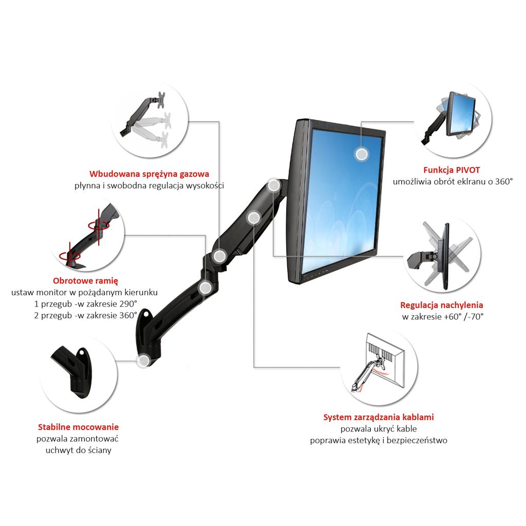 - Вбудована газова пружина дозволяє (навіть одним пальцем) вільно і плавно рухатися в будь-якому напрямку (широкий діапазон регулювання по вертикалі/горизонталі та по висоті). Тримач залишається точно на призначеному місці.;