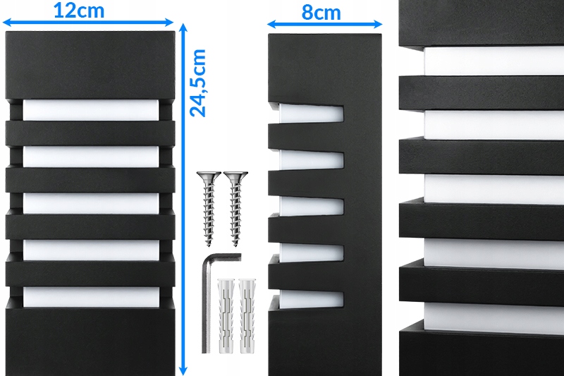 Набір включає: 1x настінний світильник, 1x шестигранний ключ, 2x розширювальні дюбелі, 2x кріпильні гвинти