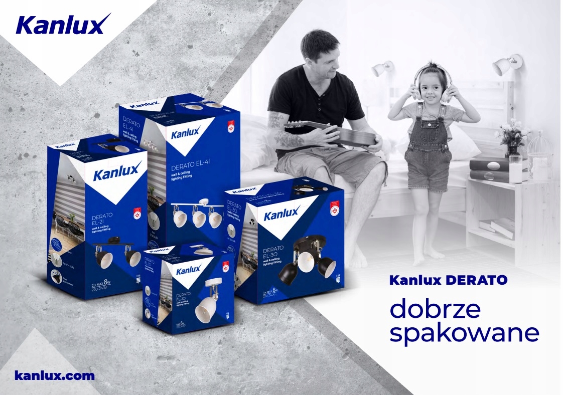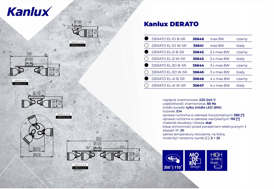 Нова серія Форма світильників Kanlux DERATO відсилає до стилю РЕТРО. Це лампи двох кольорів: білого та чорного, які мають від 1 до 4 точок світла. Одноточковий Kanlux DERATO з успіхом послужить і настінним світильником. Великі плафони цих світильників також надають широкі можливості для використання різноманітних джерел світла з цоколем Е14 (макс. 8 Вт). Світильники Kanlux DERATO мають швидкий роз'єм для зручного та швидкого монтажу. Додатковою перевагою є дуже широка можливість направлення абажура в будь-яке місце (дві осі обертання: 350 і 150 градусів).