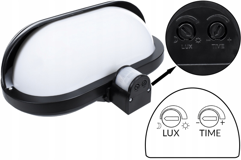 - Налаштуйте час освітлення та чутливість за допомогою двох ручок (LUX і TIME)