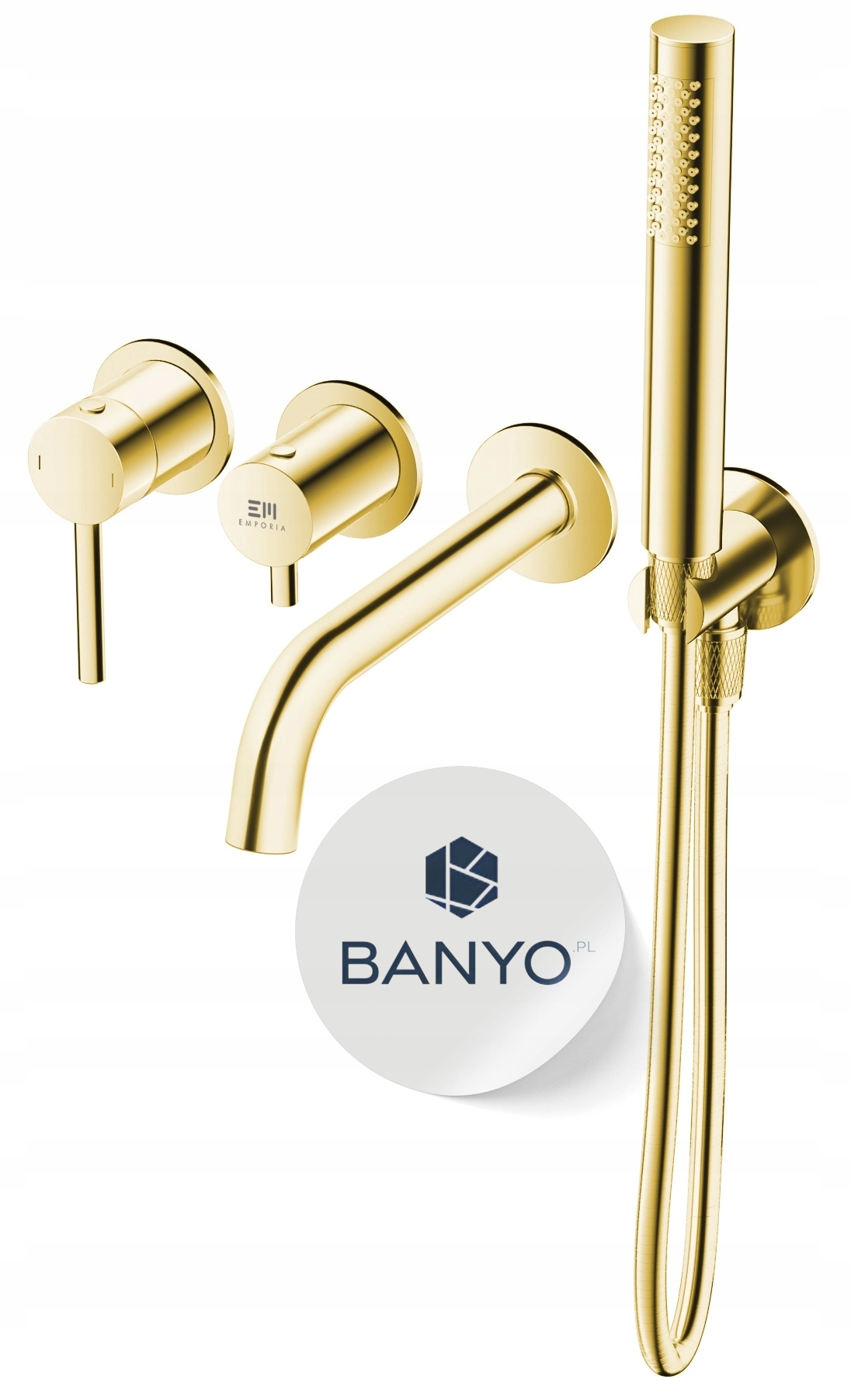 Настінний змішувач для ванни Emporia Fly золотого кольору - це елегантний і сучасний змішувач, ідеально підходить для монтажу на стіну у ванній кімнаті, характеризується простотою форми та високою якістю виготовлення.