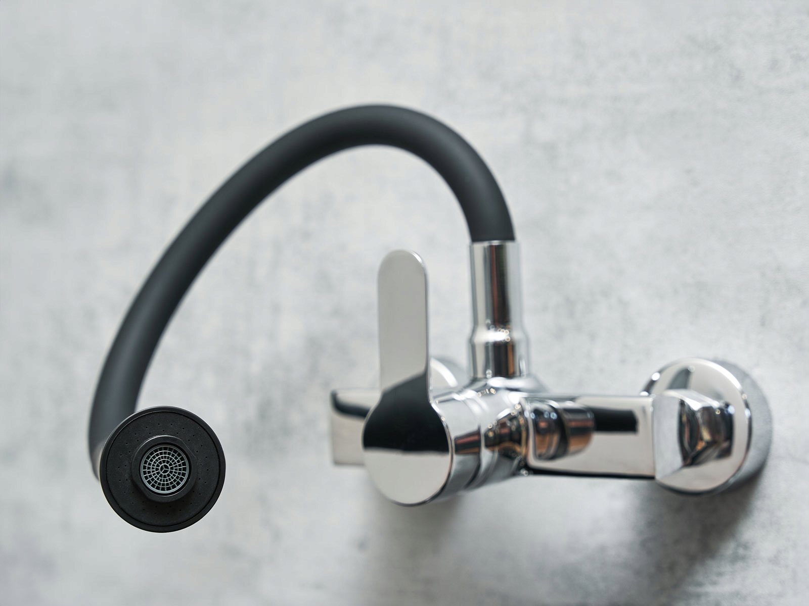 Кухонний змішувач, настінний FLEX PLUS, чорний з гнучким носиком, кухонний змішувач