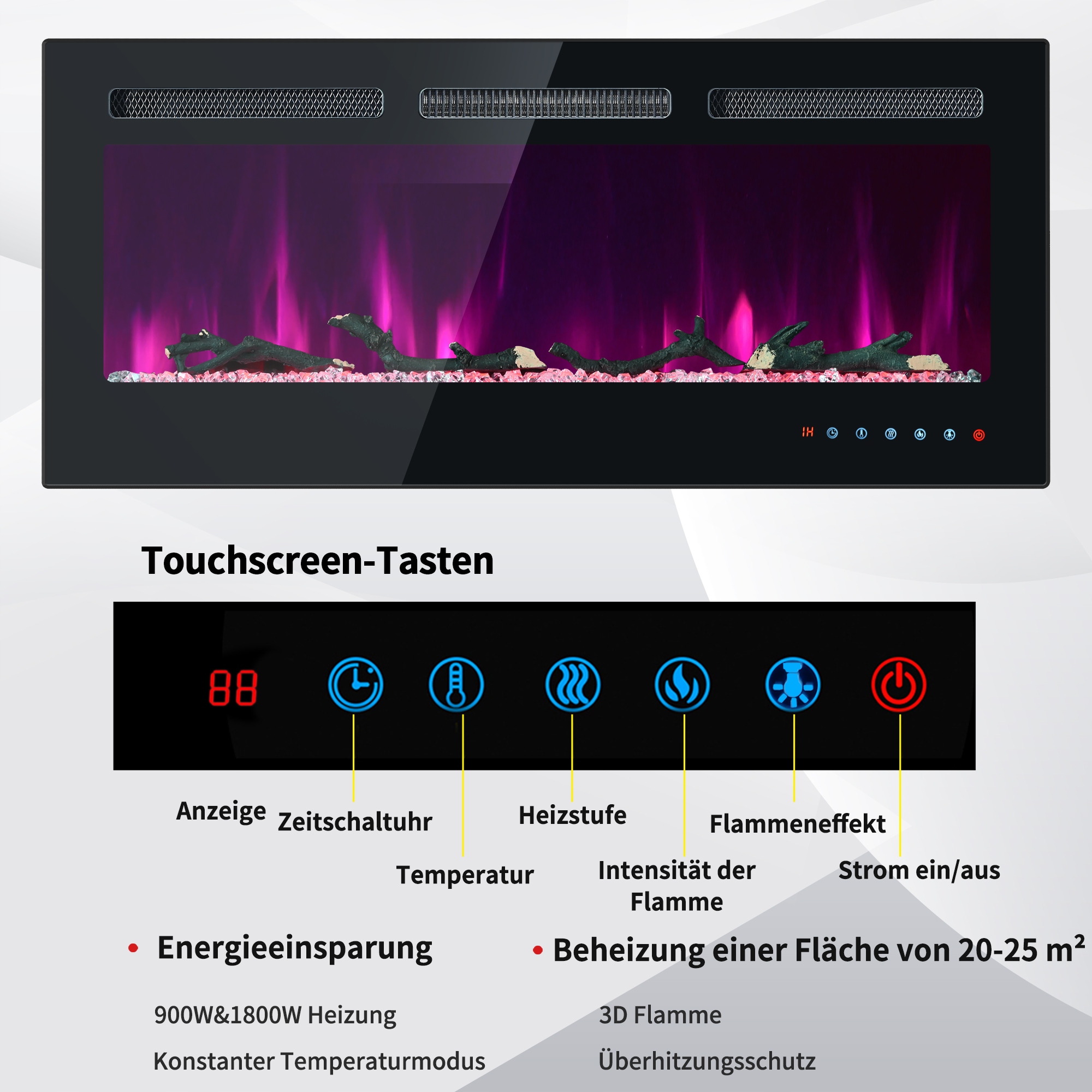 [Гнучкі параметри керування] та сенсорний екран спрощують керування всіма функціями вашого електричного каміна, включаючи ввімкнення/вимкнення, налаштування таймера від 1 до 8 годин, налаштування кольору та яскравості полум’я.