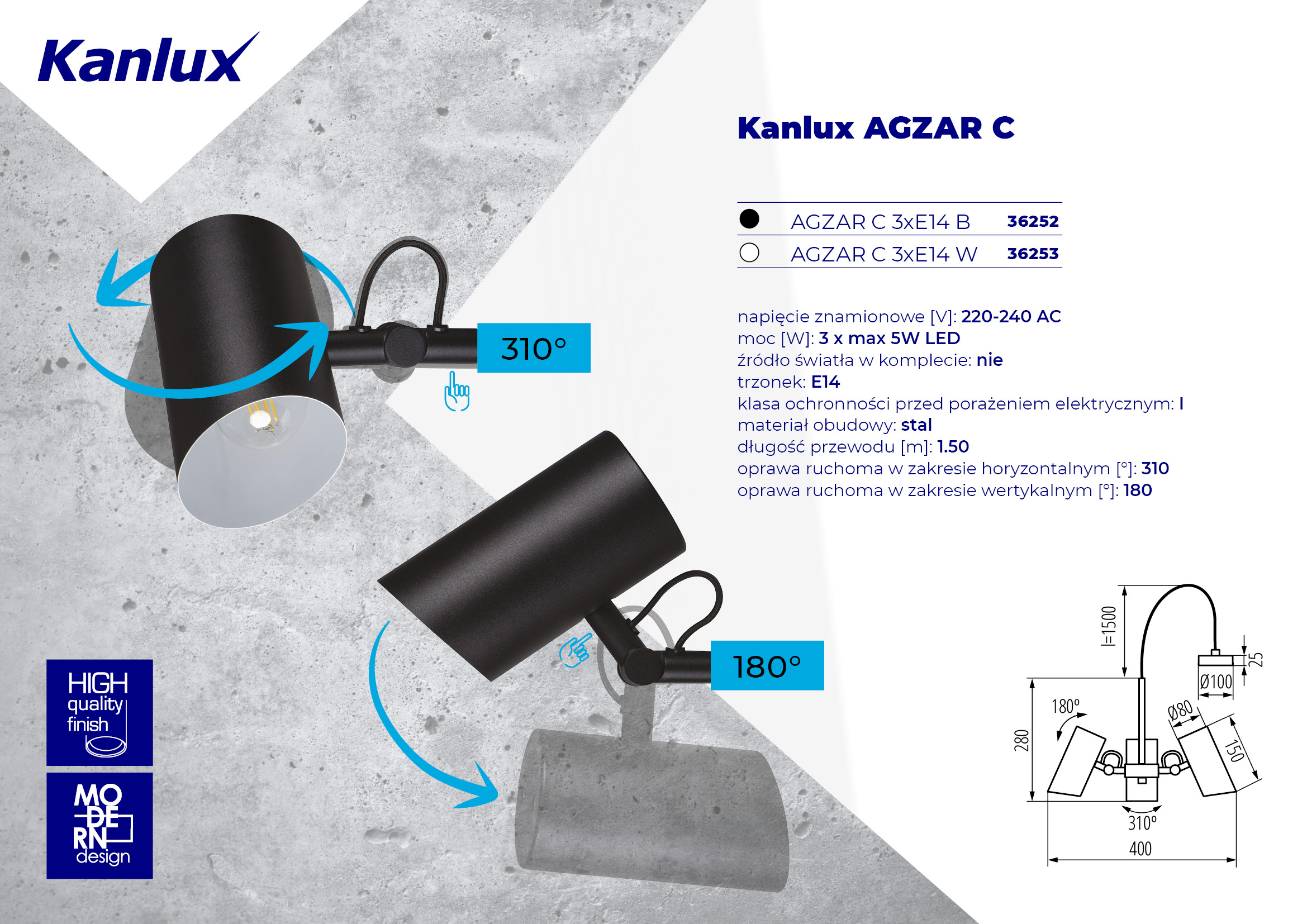Kanlux AGZAR EL це одноточкова пляма зі сталі. Безперечною перевагою цих світильників, крім сучасного дизайну, є можливість широкого повороту абажура. Кабелі обплетені тканиною, а лампа виготовлена з увагою до кожної деталі. Kanlux AGZAR EL адаптований до джерела світла з цоколем E14 і максимальною потужністю 5 Вт.