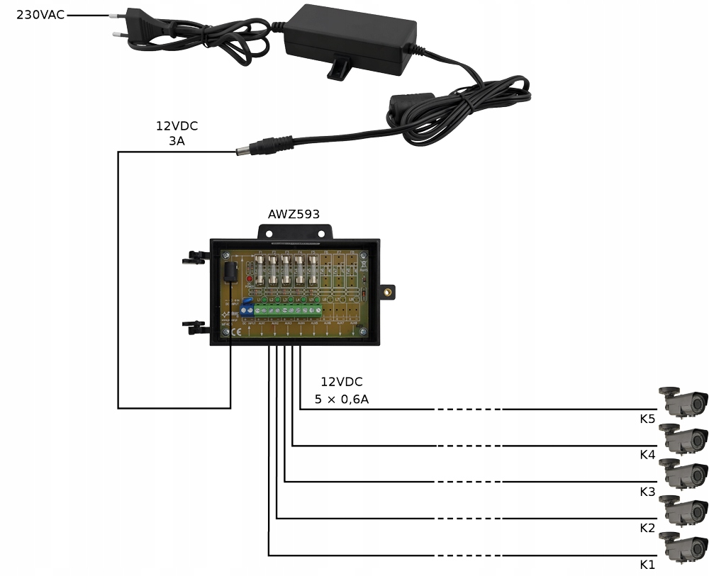 Джерело живлення завершується штекером 12 В постійного струму на кабелі, а на іншому кінці – штекером 230 В на кабелі.