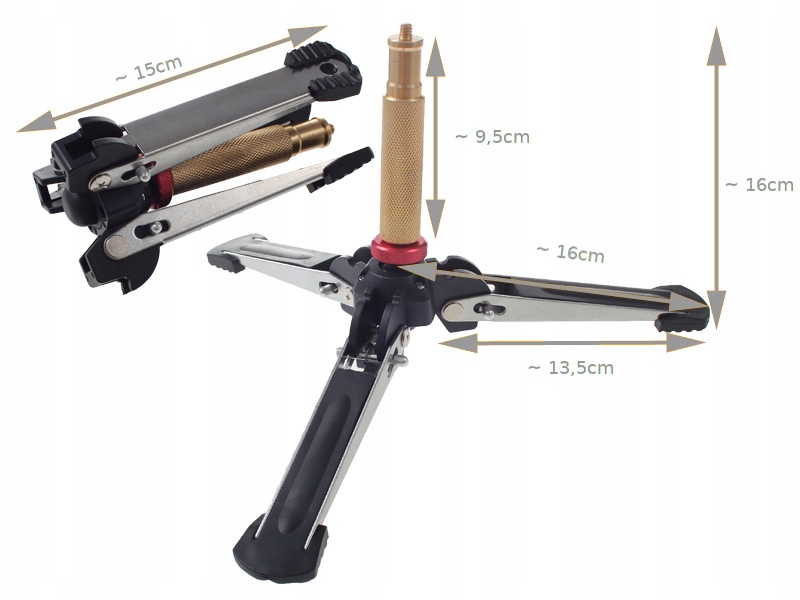 Штатив із зовнішньою різьбою 3/8" в основі, студійною головкою 16 мм, що загвинчується, і різьбою 1/4" довжиною 9,5 см, завдяки використанню кульової головки забезпечує плавне регулювання нахилу та положення смартфона, камери, дзеркальної фотокамери.