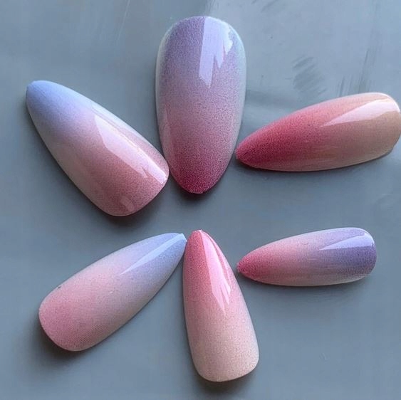 ✔️Вибрана модель у красивому блискучому рожево-фіолетовому кольорі. блакитний колір.форма стилет, з ефектом омбре.