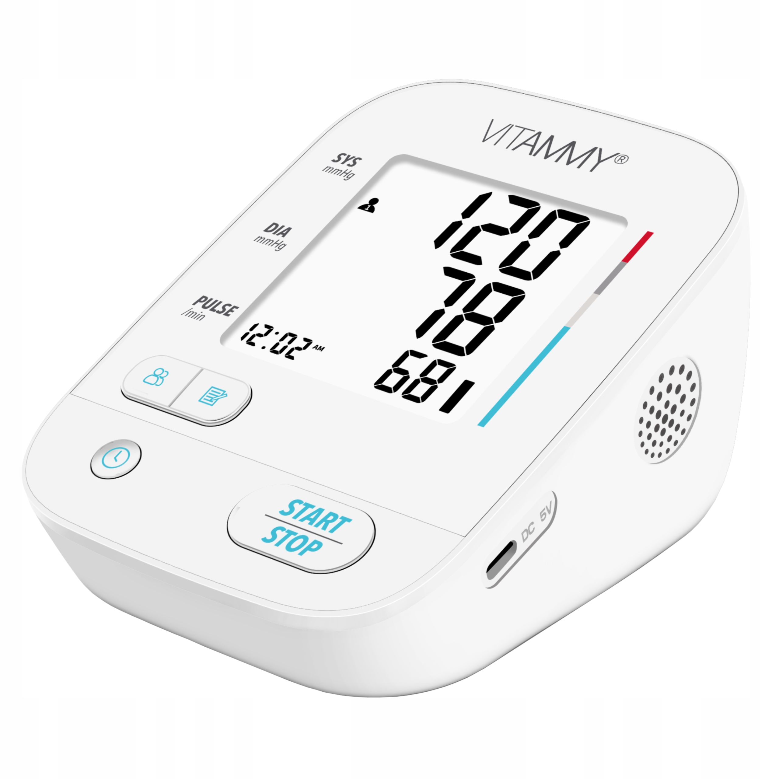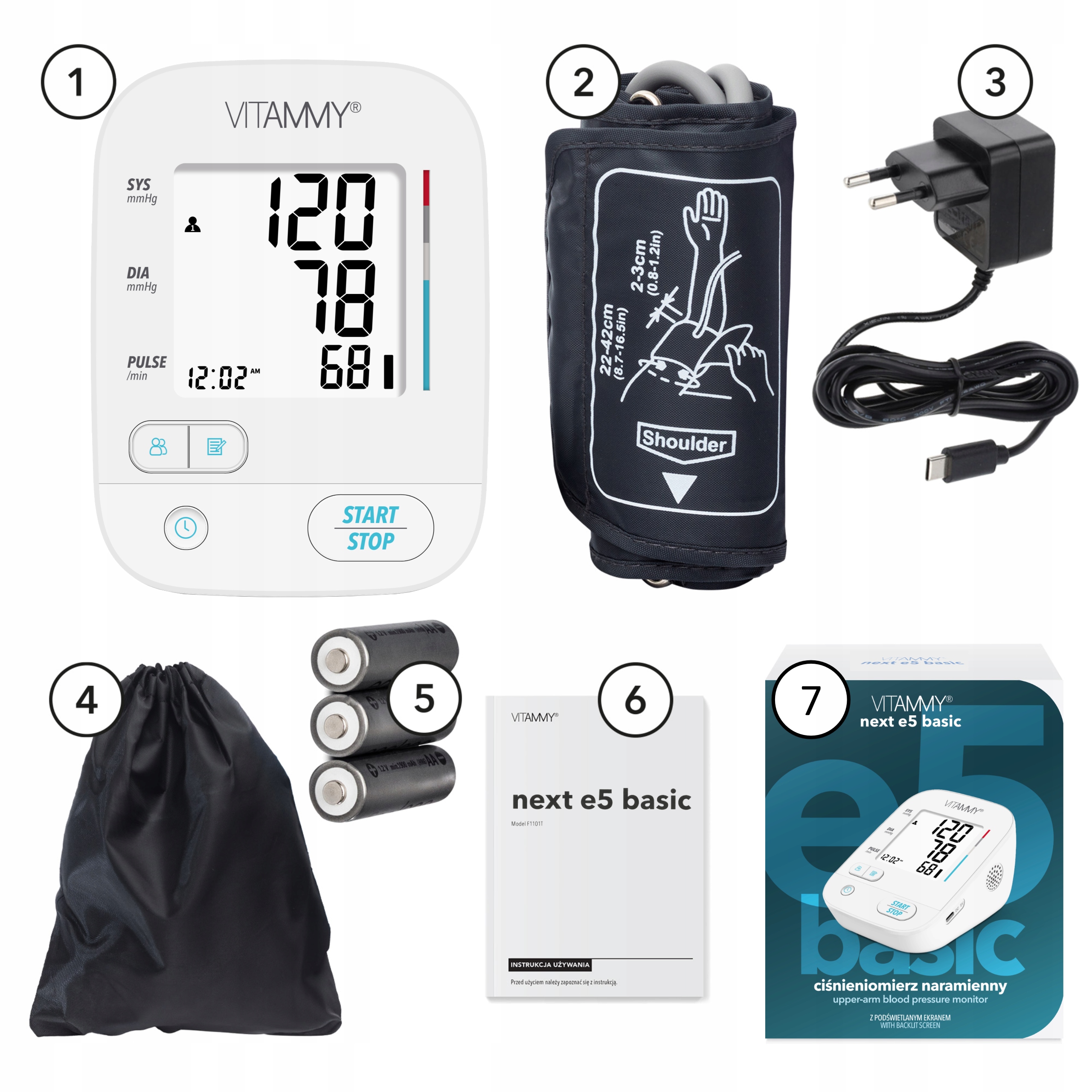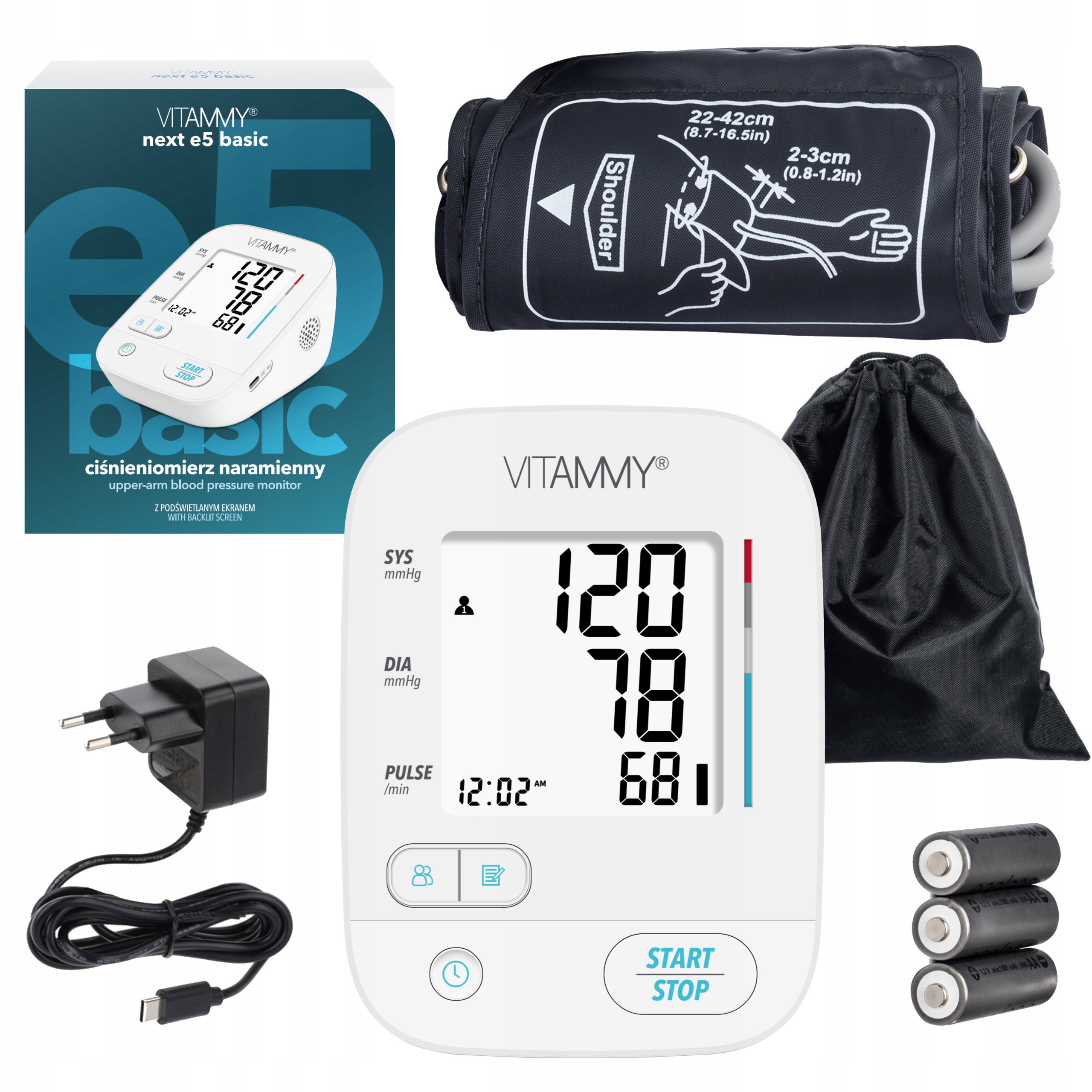 Вітаммі Next E5 базовий манометр - це повністю автоматичний, сучасний медичний пристрій. Після надання манжети, маючи функцію, що контролює правильне розташування та натискання кнопки, камера вимірює артеріальний тиск, частоту серцевих скорочень та виявляє аритмію серця. Тиск вимірюється сучасним методом, який вже при перекачуванні манжети. Результати вимірювань показують на освітленому РК -дисплеї у вигляді великих та чітких чисельності, що полегшують їх читання. Монітор артеріального тиску продається в наборі з медично сертифікованим джерелом живлення.