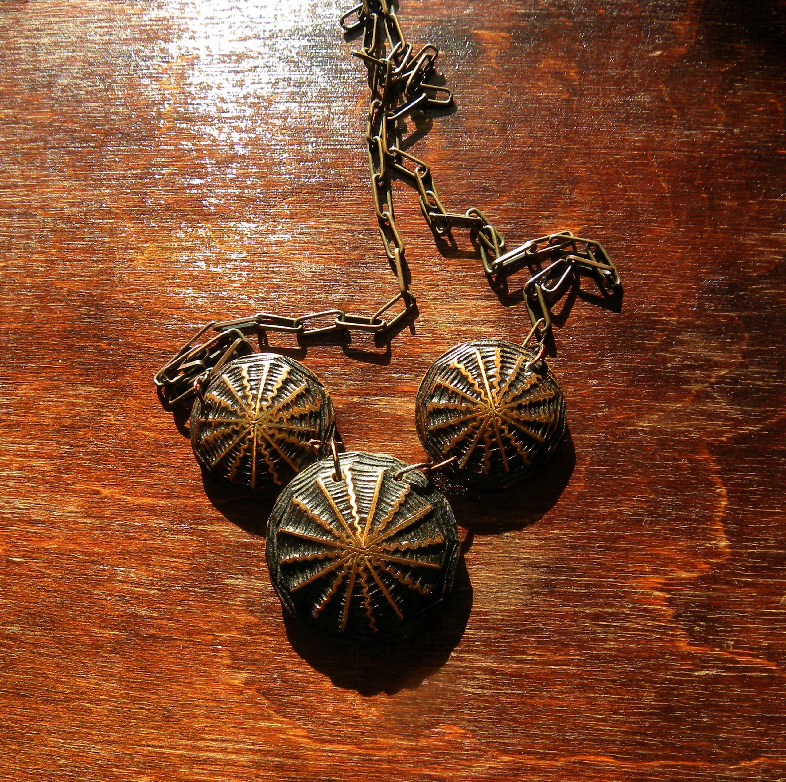 NASZYJNIK DREWNO INKRUSTOWANE MIEDZIĄ PRL