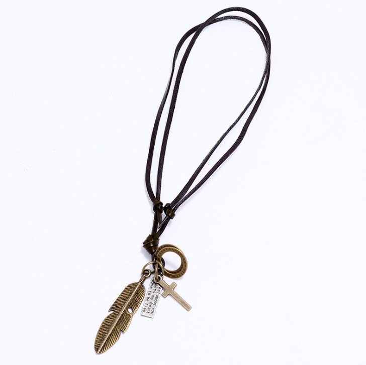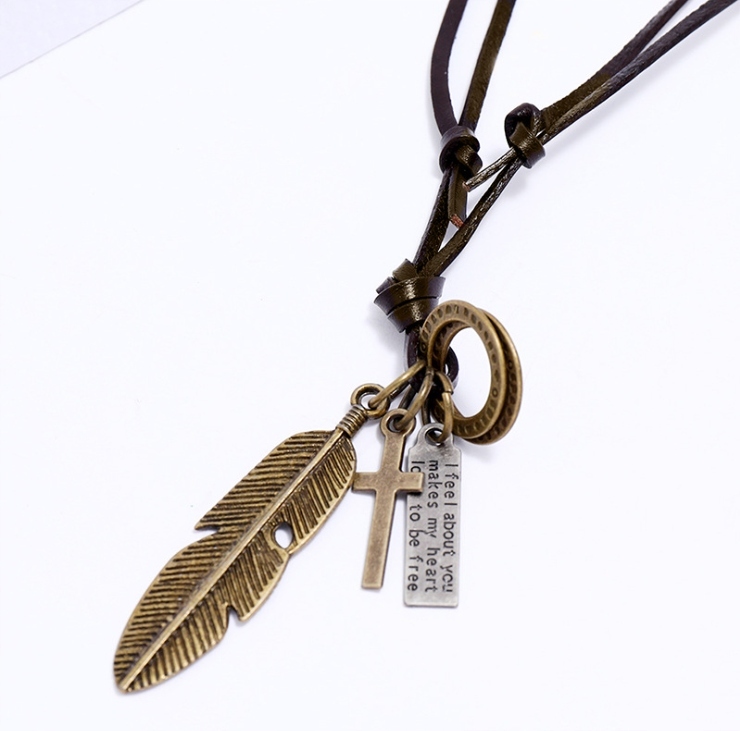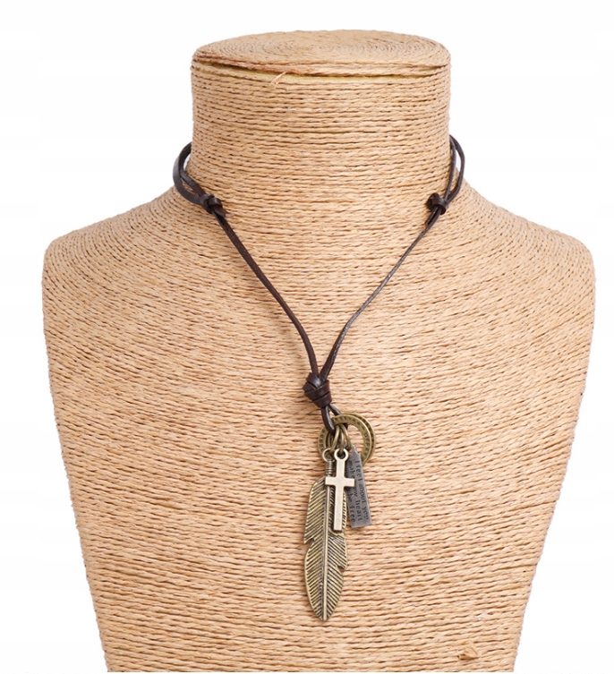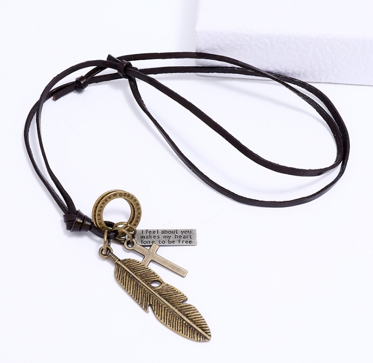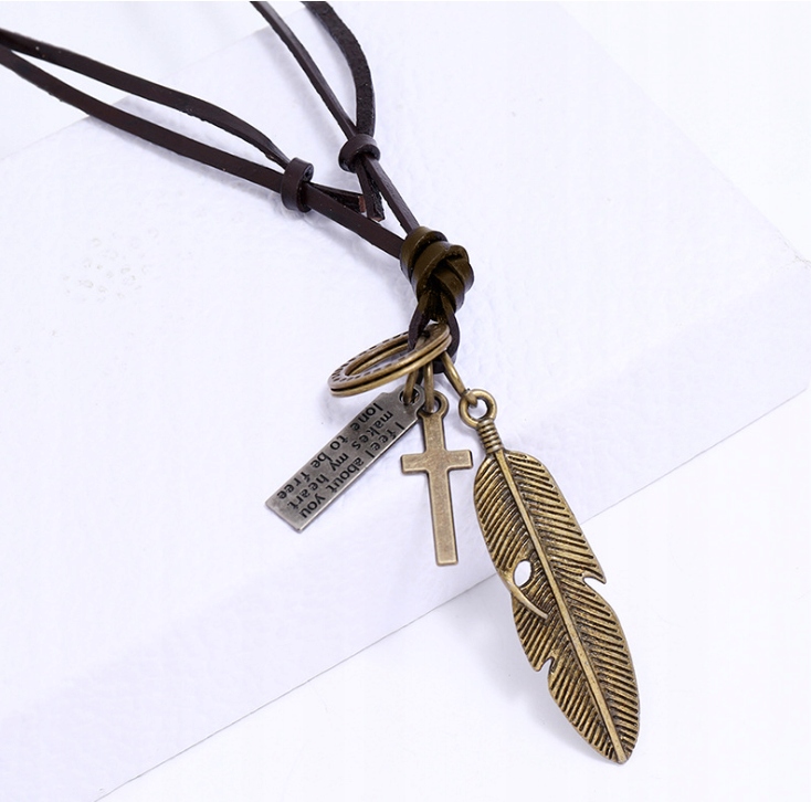 Naszyjnik ze skóry bydlęcej z piórami punk brązowy