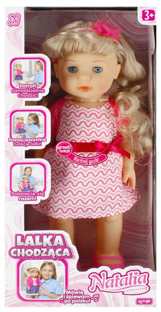 Двічі поплескайте в долоні перед лялькою і виведіть Наталю на прогулянку. Лялька розмовляє та співає польською мовою, що ще більше порадує її власника під час гри. У Наталії красиве довге світле волосся та гарний одяг. Вона завжди охоче грається з дитиною.