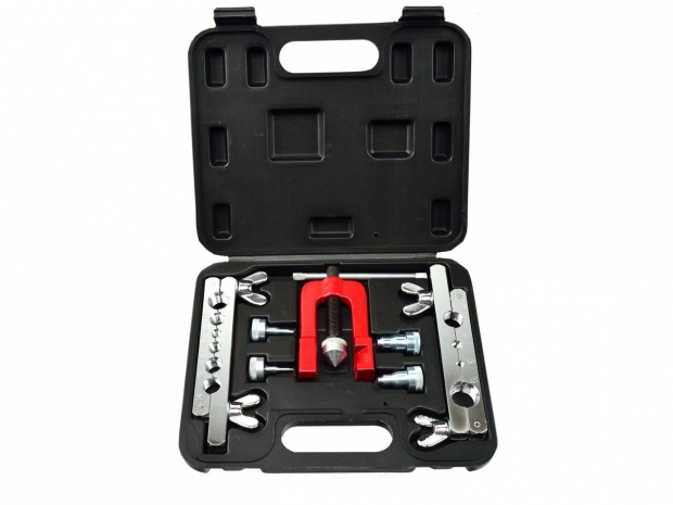 Набір для обтиску гальмівних магістралей з пресом для ручного розширення труб. Призначений для ручного розширення труб і виготовлення конічних фланців 90º. Оброблена трубка встановлюється у відповідний отвір матриці і протягується за допомогою викрутки. Для використання в системах опалення, кондиціювання та гальмування. Призначений для ручного розширення наконечників зі сталі, кольорових металів, алюмінію та пластику.