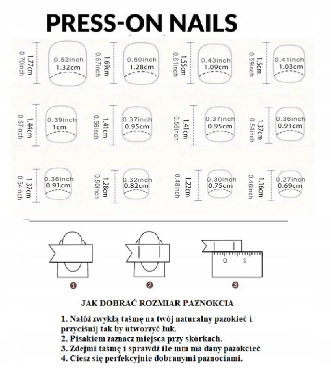 У упаковці ви знайдете 24 цвяхи в 12 розмірах, наклейка (подвійна стрічка, щоб приклеїти нігтя) та міні -файл