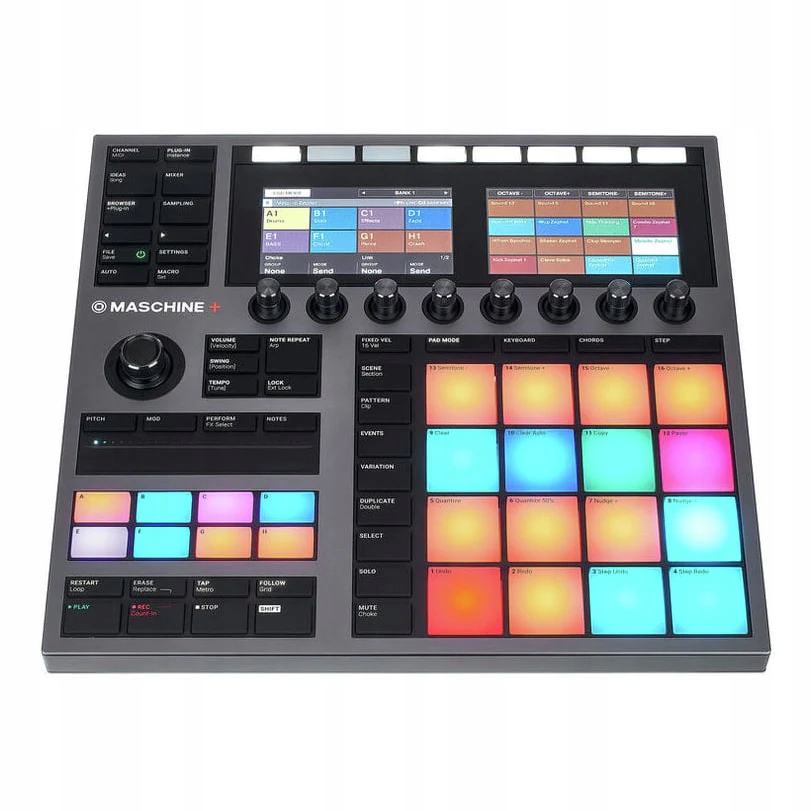 З MASCHINE+, Native Inst ruments представляє свій перший groovebox для семплювання, аранжування та композиції та встановлює високу планку. На основі MASCHINE Mk3 «Plus Version» є автономним пристроєм, який може працювати автономно без комп’ютера. Два кольорові дисплеї, 16 чутливих до швидкості багатоколірних панелей, стрічкові контролери та численні кнопки та ручки, а також вбудований високоякісний аудіоінтерфейс 44,1 кГц / 24 біта та потужний чотирьохядерний процесор і 4 ГБ оперативної пам’яті створюють міцна основа для створення музики незалежно від DAW.