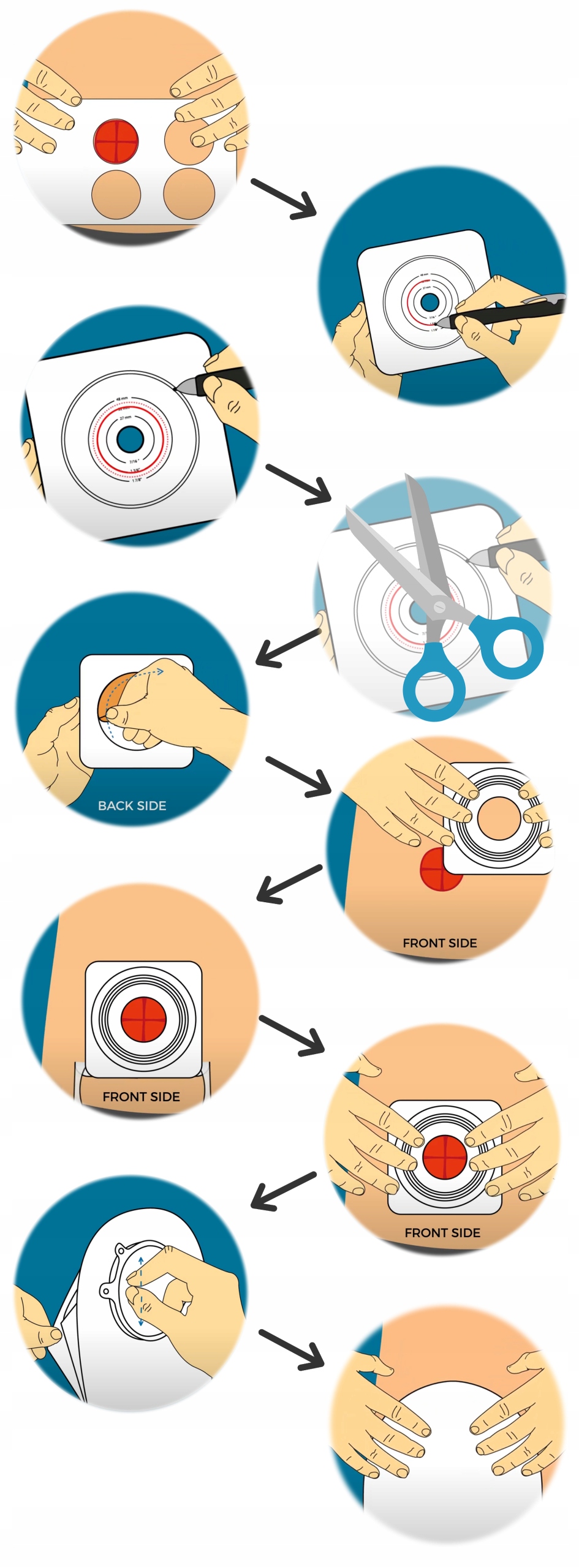 - пошкоджена або серйозно роздратована шкіра навколо стоми, запобігаючи належній адгезії тарілки. Перевищення розміру 32 мм або потребує іншого типу плитки (наприклад, плоский або для моделювання).