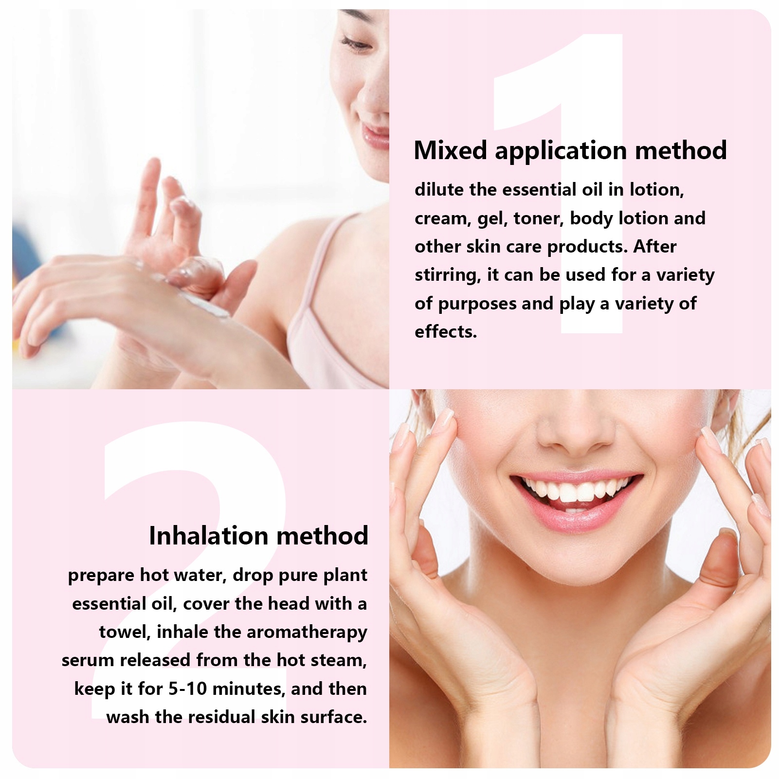 1. Змішаний метод використання: розведіть ефірну олію в лосьйоні, кремі, гелі, тоніку, лосьйоні для тіла та інших продуктах для догляду за шкірою. Після змішування його можна використовувати для різних цілей і відтворювати різні ефекти.