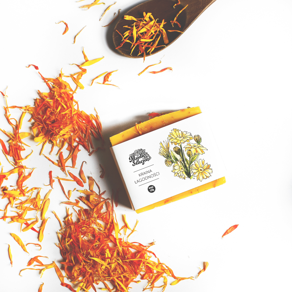 Це мило з почуттям. Може здатися, що це маленький оранжево-жовтий кубик, але він викликає багато емоцій і переживань. Перш за все, або незважаючи на те, що це не ліки, його дія часто має цілющі властивості. Квітка календули, мацерована в лляній олії, є універсальною травою, яка заспокоює всі подразнення, дезінфікує та зміцнює тканини шкіри. Надлишок лляної олії та інших, таких як кокосова олія, олія ши або оливкова олія, робить дуже роздратовану шкіру гладкою та швидше заживає. Доповненням є сире червоне пальмове масло, яке багате на вітаміни А та Е, які дуже важливі для захисту нашої шкіри. Мило має поживні, регенеруючі та захисні властивості. Рекомендовано навіть маленьким дітям.