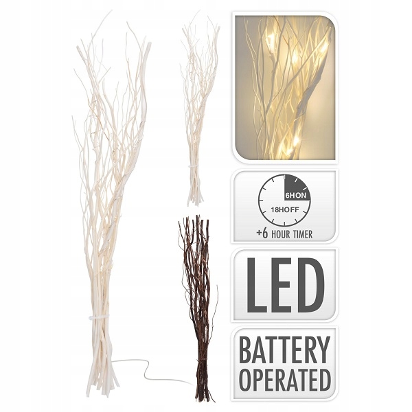 Гілочки зі світлодіодними підсвічуваннями чудово впишуться в композицію або як окрема прикраса для вази. Вони мають таймер, який економить заряд батарейок. Виріб живиться від 2xAA (не входить в комплект).