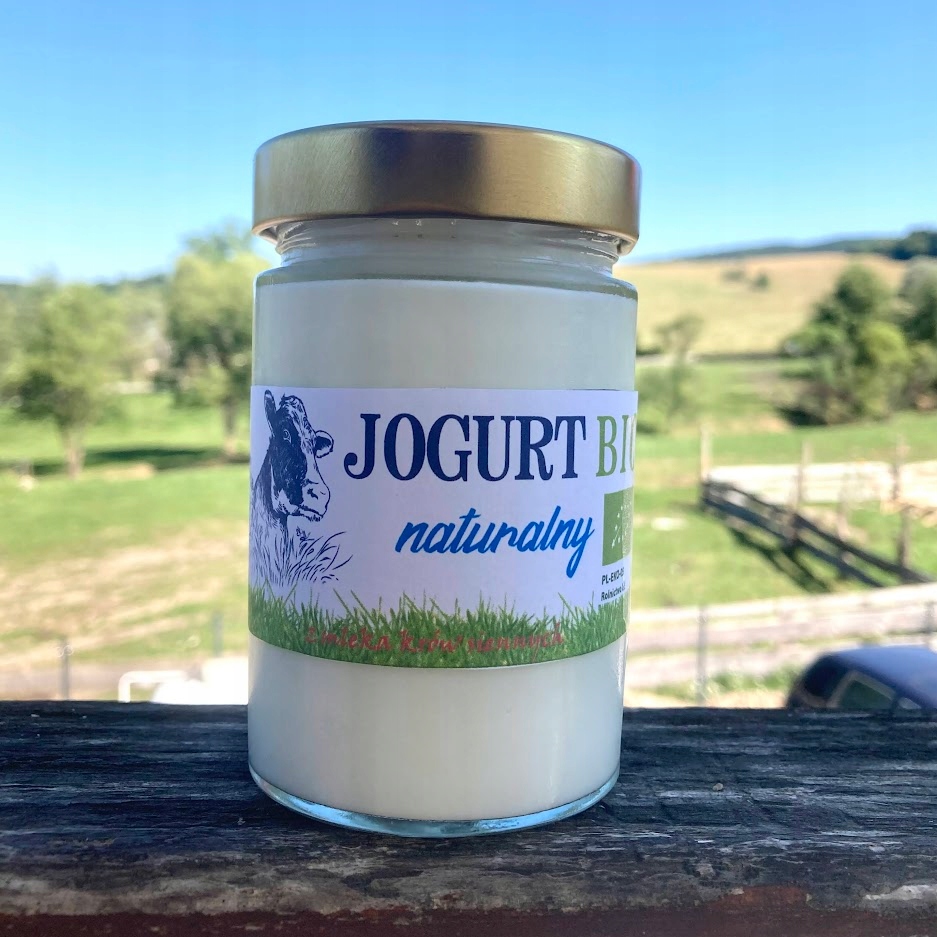 Натуральний органічний йогурт, виготовлений з злегка пастеризованого коров’ячого молока з корів сіна. Молоко походить від екологічної ферми Figa, розташованої в низьких бескідах, далеко від промисловості та збільшення трафіку. Дуже смачно, досить густий. Його можна їсти безпосередньо або використовувати для салатів, заправок, десертів та інших страв. Ми наповнюємо сірими паперовими порожніми місцями для стабілізації продуктів у упаковці. Ми обгортаємо її розтяжкою.